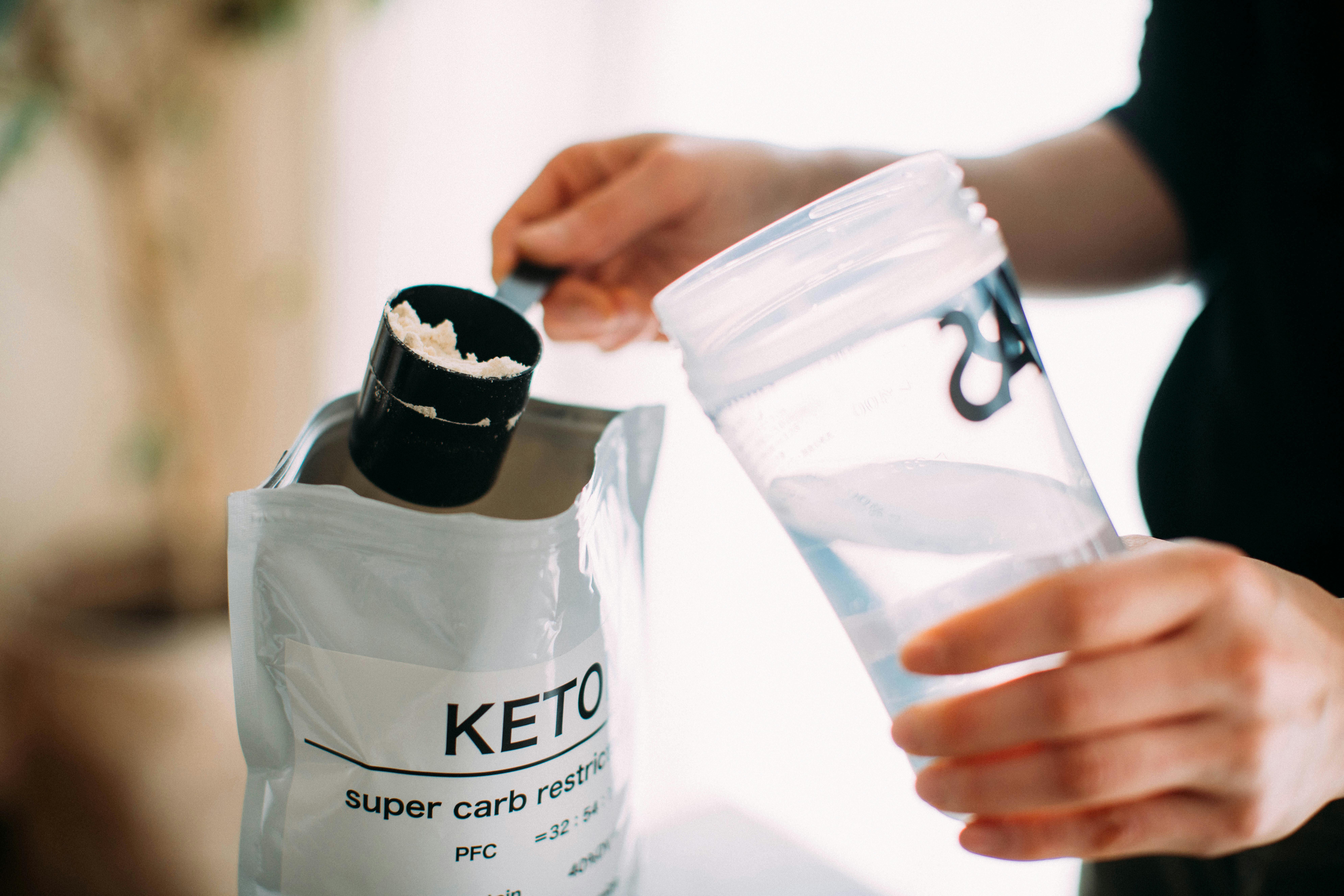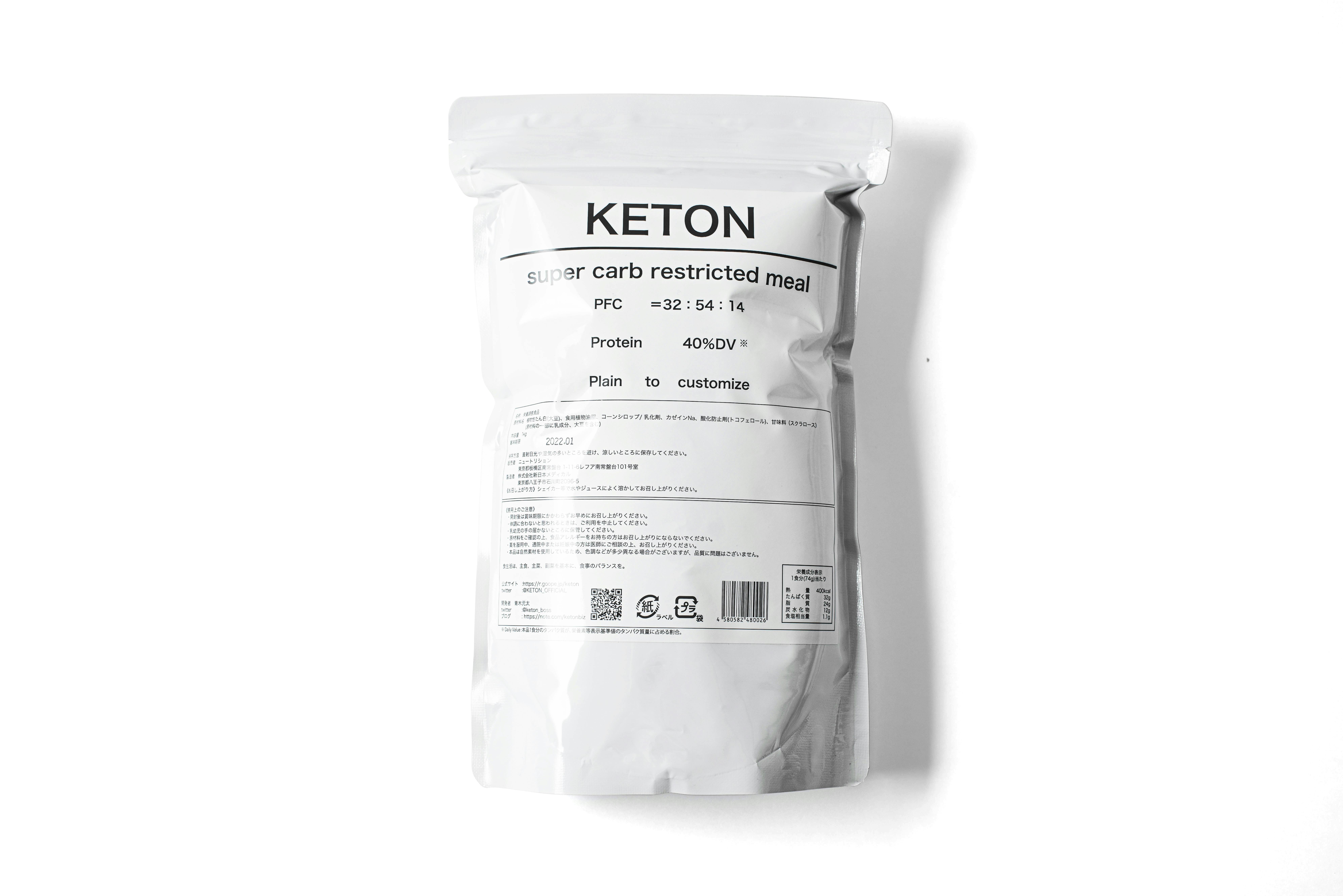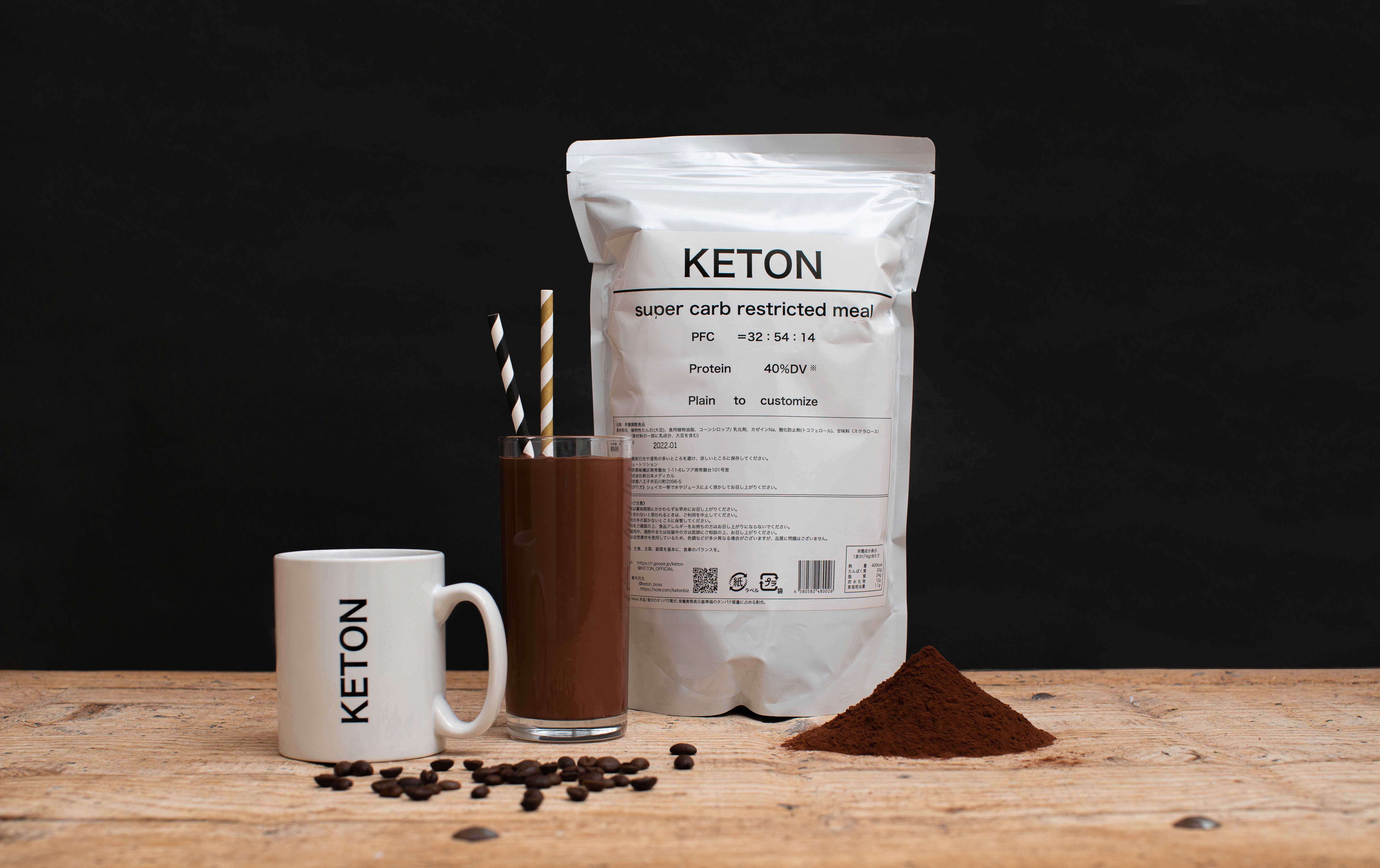 KETONはプロテインのような粉末飲料です。一方、プロテインとの相違点はタンパク質や 脂質、炭水化物を複合的に取れる商品となっております。手軽に、かつ、スーパー糖質制限において理想的な栄養が取れる食事となっております。