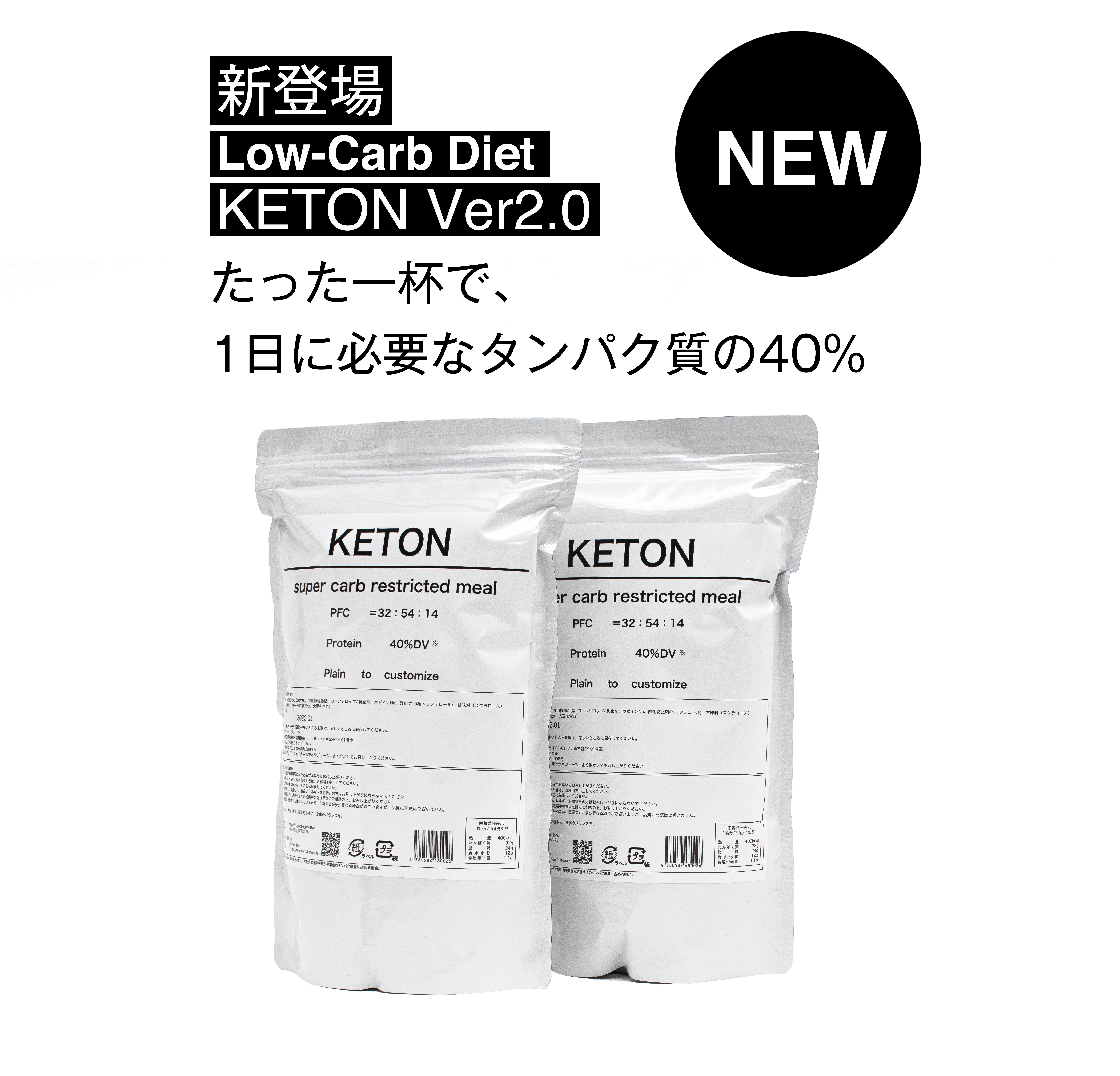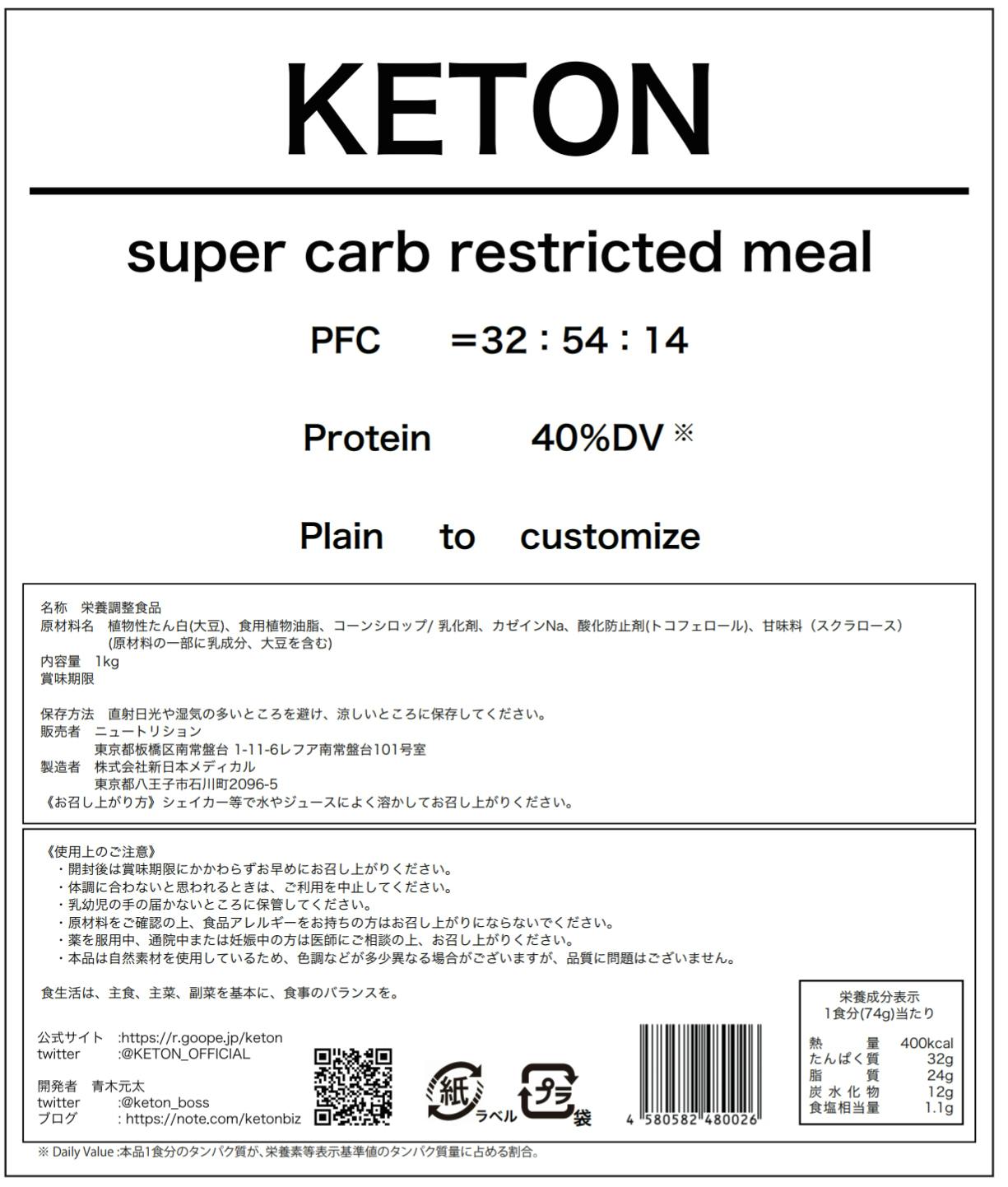 本商品、KETONはスーパー糖質制限に準拠しPFCバランスが32:54:14となっております。