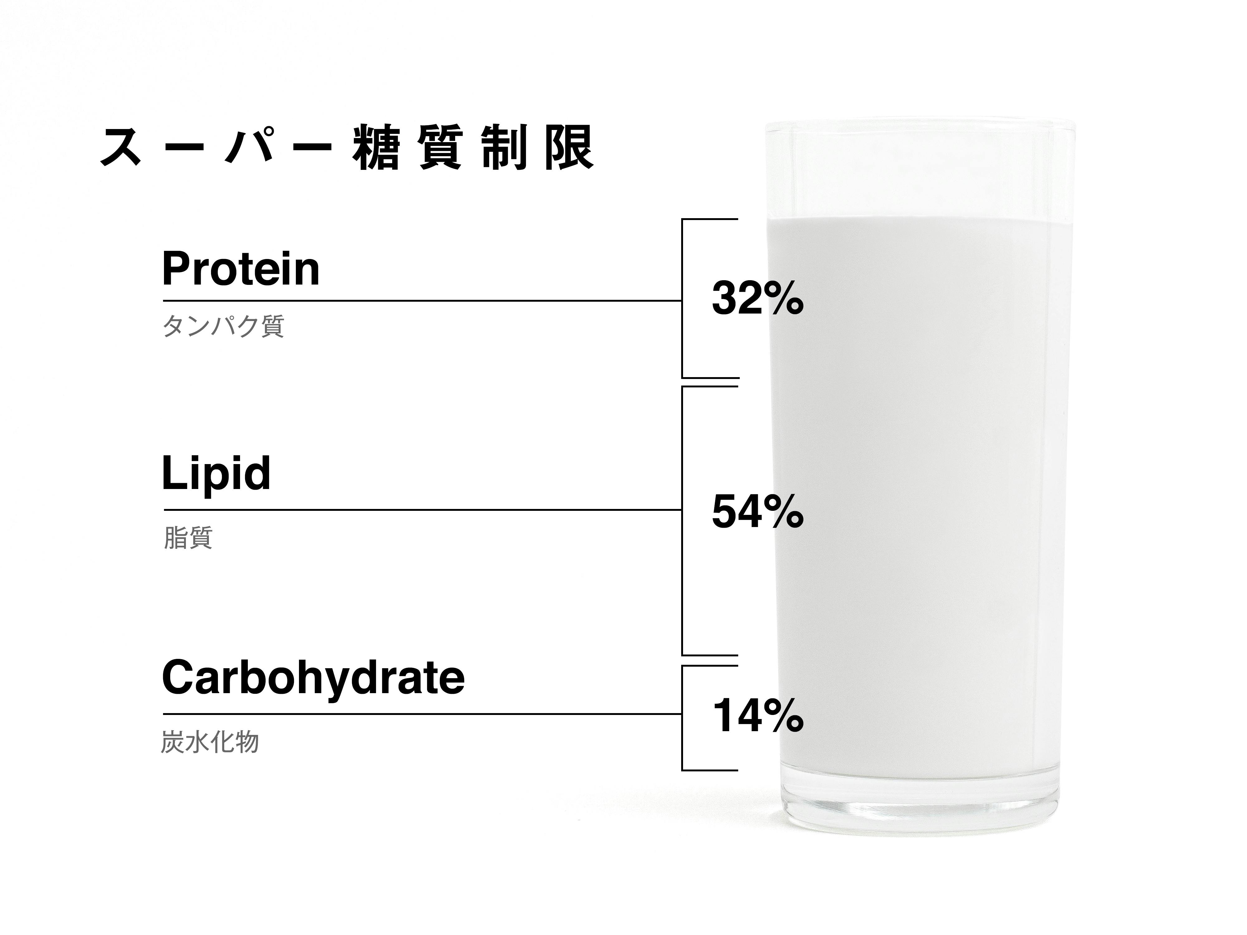 皆様は糖質制限をご存知でしょうか。糖質制限は炭水化物(糖質)の摂取量を減らす食事法です。一方で、脂質から主要なエネルギーを摂取します。糖質制限は大きく「プチ糖質制限」「スタンダード糖質制限」「スーパー糖質制限」がございます。この商品は、最も糖質摂取量が少ない「スーパー糖質制限」に注目して開発した商品で、「スーパー糖質制限」で推奨されるPFC(三大栄養素)バランスに準拠して栄養素を配合いたしました。