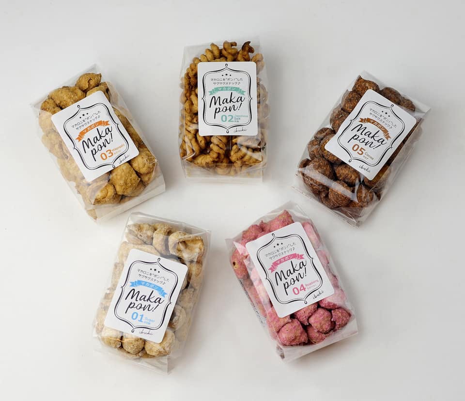 マカポンとは、懐かしい“お米を膨らます” ポン菓子機械でシェル型マカロニを「ポン!」と膨らませたもの。「ポン!!」と圧力をかけて、はじかせたポン菓子は昔ながらのシンプルなお菓子です。マカロニの形を残していますが、食感はサクサクふわふわっと軽く、シンプルなおいしさで食べ始めると止まらないお菓子です。