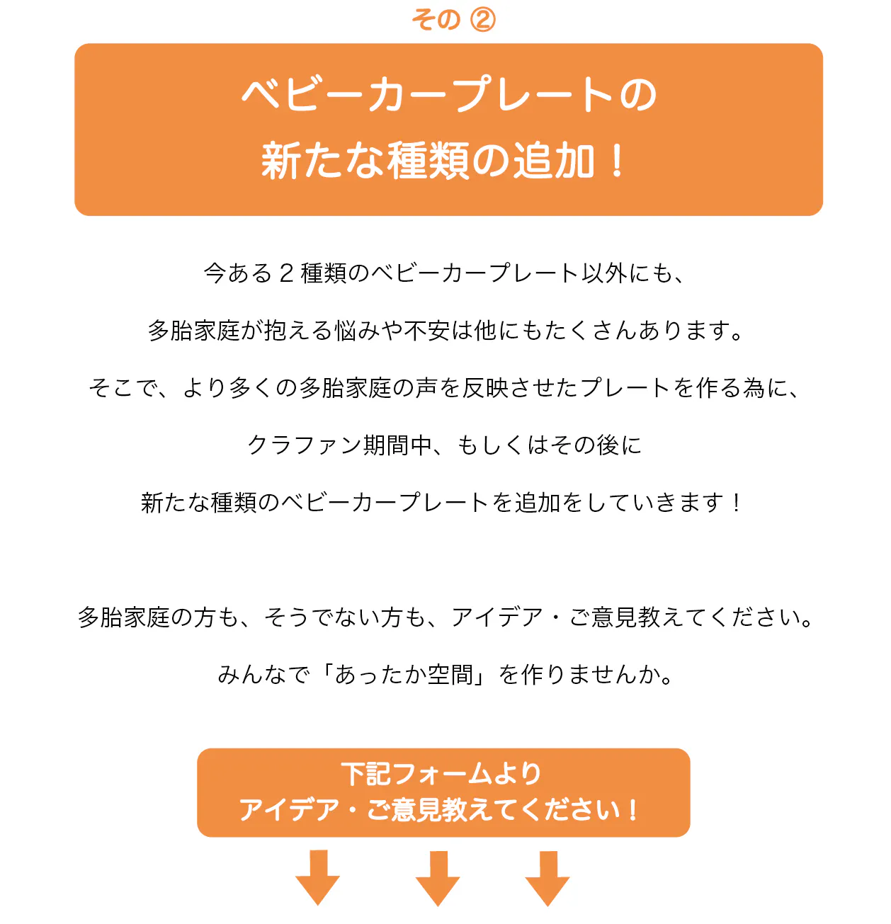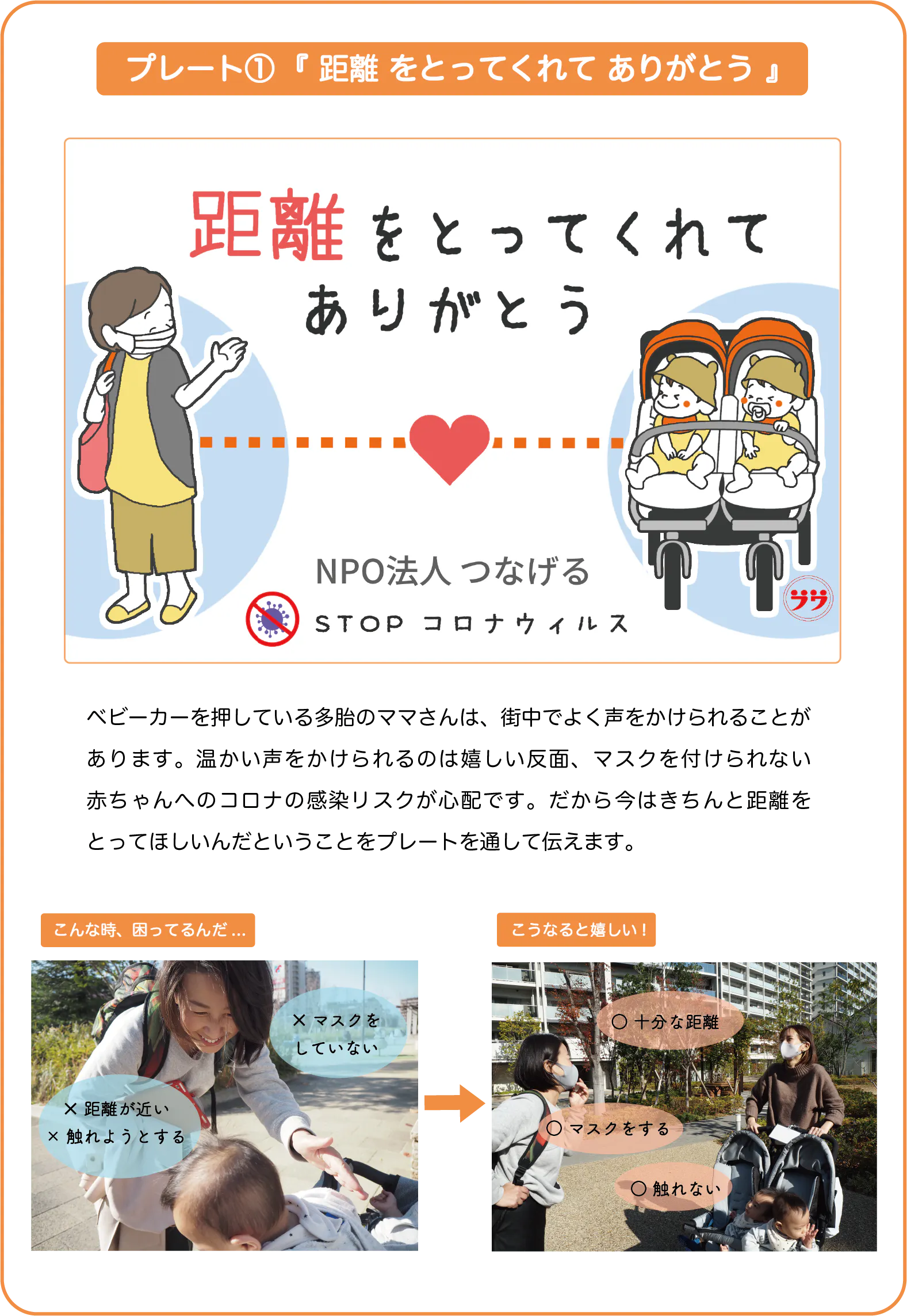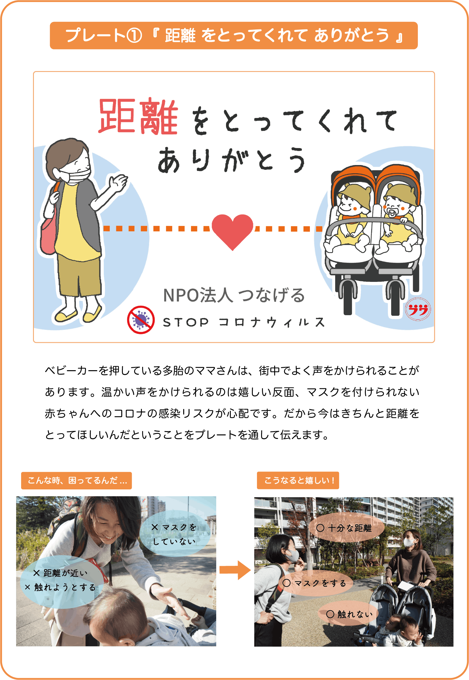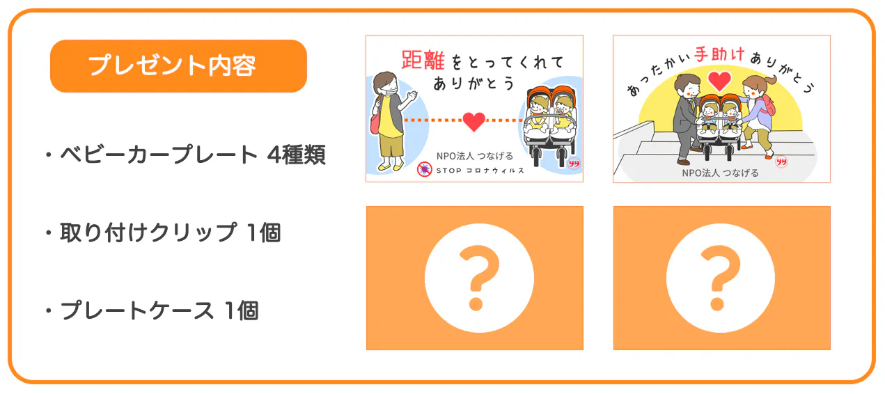 2021/04/11 16:55こんにちは!皆さんに2つご報告です!◆ベビーカープレートのプレゼント(第二弾)お待たせしました!3/1以降に応募いただいたご家庭にプレートをお届けしました!届いた方は、ぜひSNSで「#ベビーカープレート」とつけてつぶやいてくださると、私たちがうれしいのはもちろんですが、皆さんのフォロワーの方が、「多胎のママってこんな風に思ってたんだな〜」と多胎の現状を知ってくれる良い機会になると思っています!クラファンページ経由で募集していた計56のご家庭をもってプレゼントの応募は締め切りとさせていただきました。このままだと「100の家庭に配ることを約束していたのに、残りの34のプレートは???」と思う方もいるはず。(100の家庭に配ることを覚えているのは、なかなかなヘビービュアーだと思いますが笑)◆残りは、イベントに参加してくださった34の家庭にプレゼントしました。4/10に、NPO法人つなげるが多胎家庭向けにイベントを開催しました。このイベントに参加してくださった34の多胎家庭にベビーカープレート一式をプレゼントしました。東京でのイベントのため直接は会えませんでしたが、いつかまたプレートを届けた皆さんと話せる機会を作れたらいいなと思っていますので、その時は色々お話聞かせてくださいね♪◆最後に私たちは、このクラファン全体を通して、「声をあげる力」を皆さんに伝えたいと思っていました。そのためには、まずは自分自身が声を出して、結果で示そう!と活動報告書やSNSで自分たちの気持ちを表現してきました。時には自分から声をあげること。自分発信で「距離をとって欲しい」「手伝って欲しい」と伝えること。ちょっと勇気を出して「#ベビーカープレート」をつけて普段思っていることをつぶやくこと。これまでの私たちの活動が、皆さんにとって「声をあげる勇気」となればうれしいです。それではまた! もっと見るNPO法人つなげるのホームページにて、「ベビーカープレート」の素材をダウンロードできるようになりました!