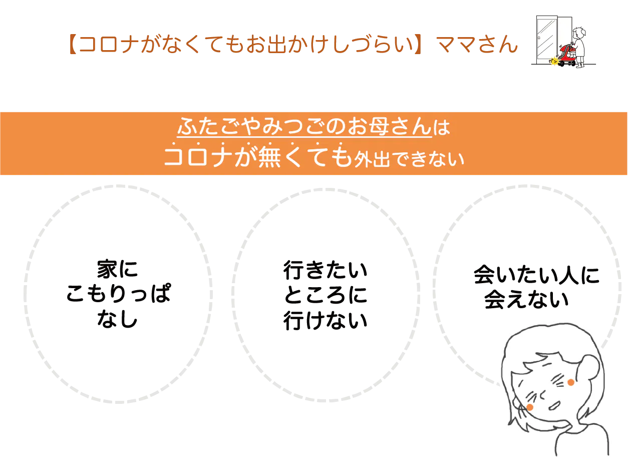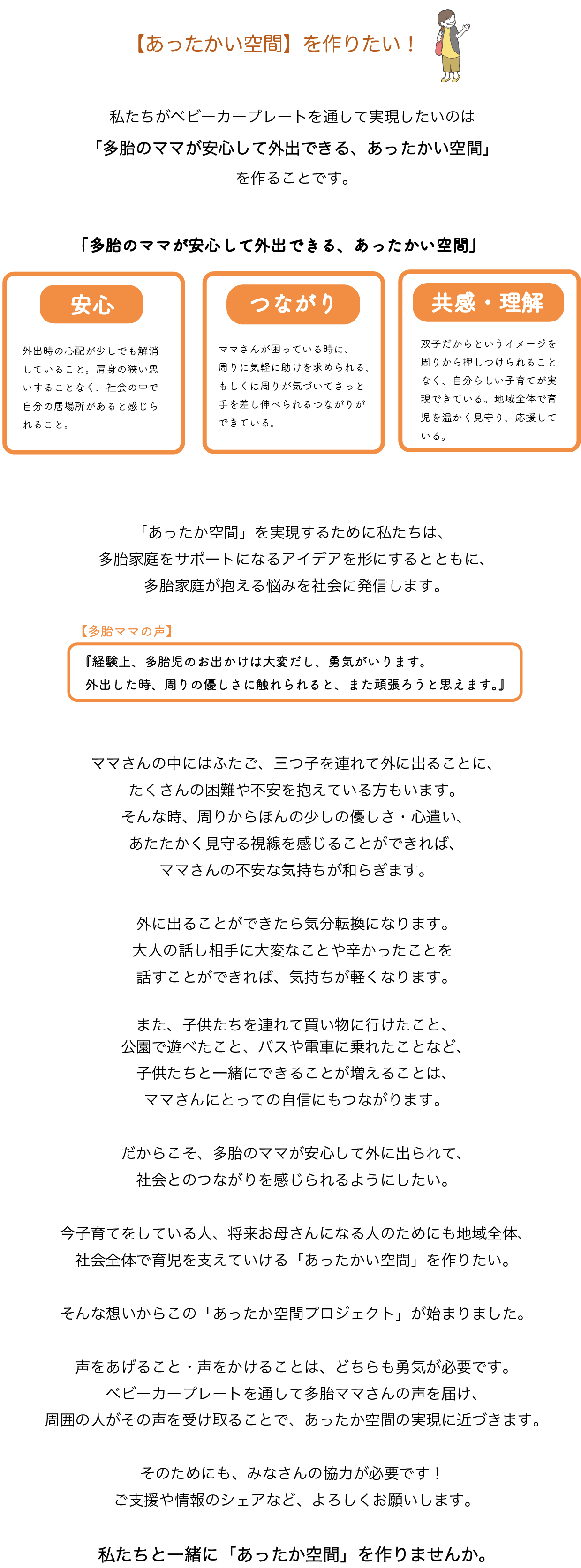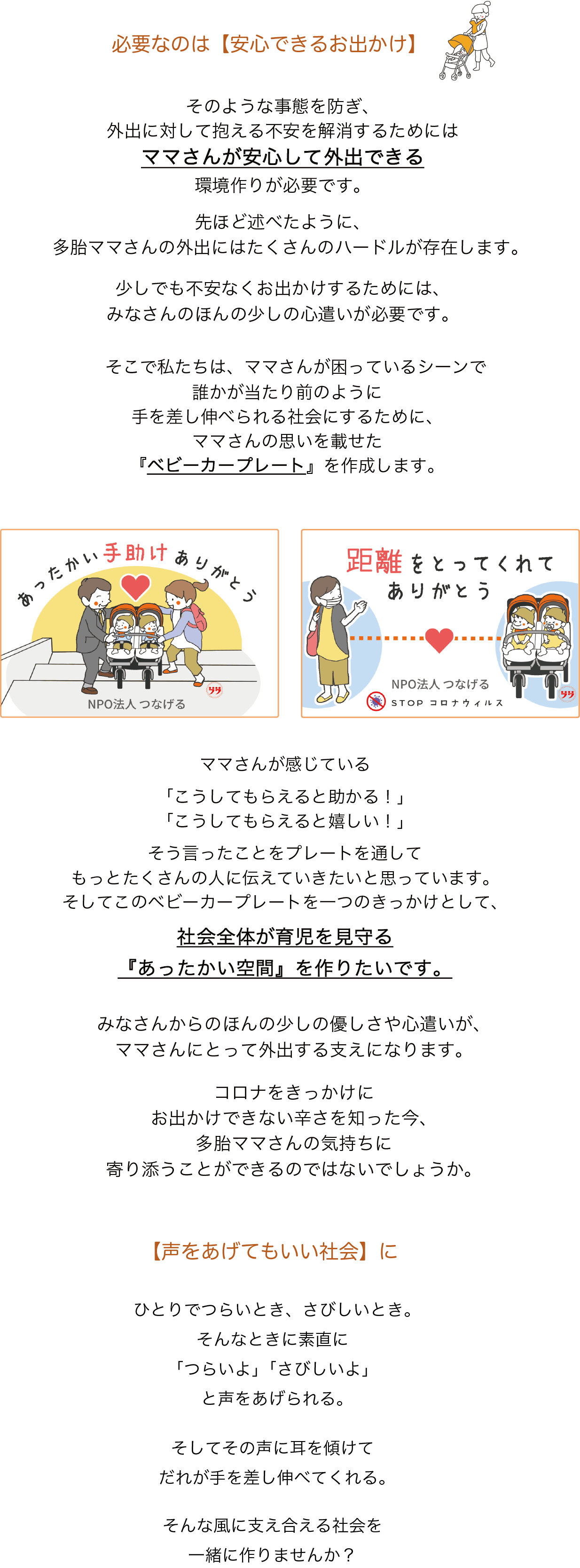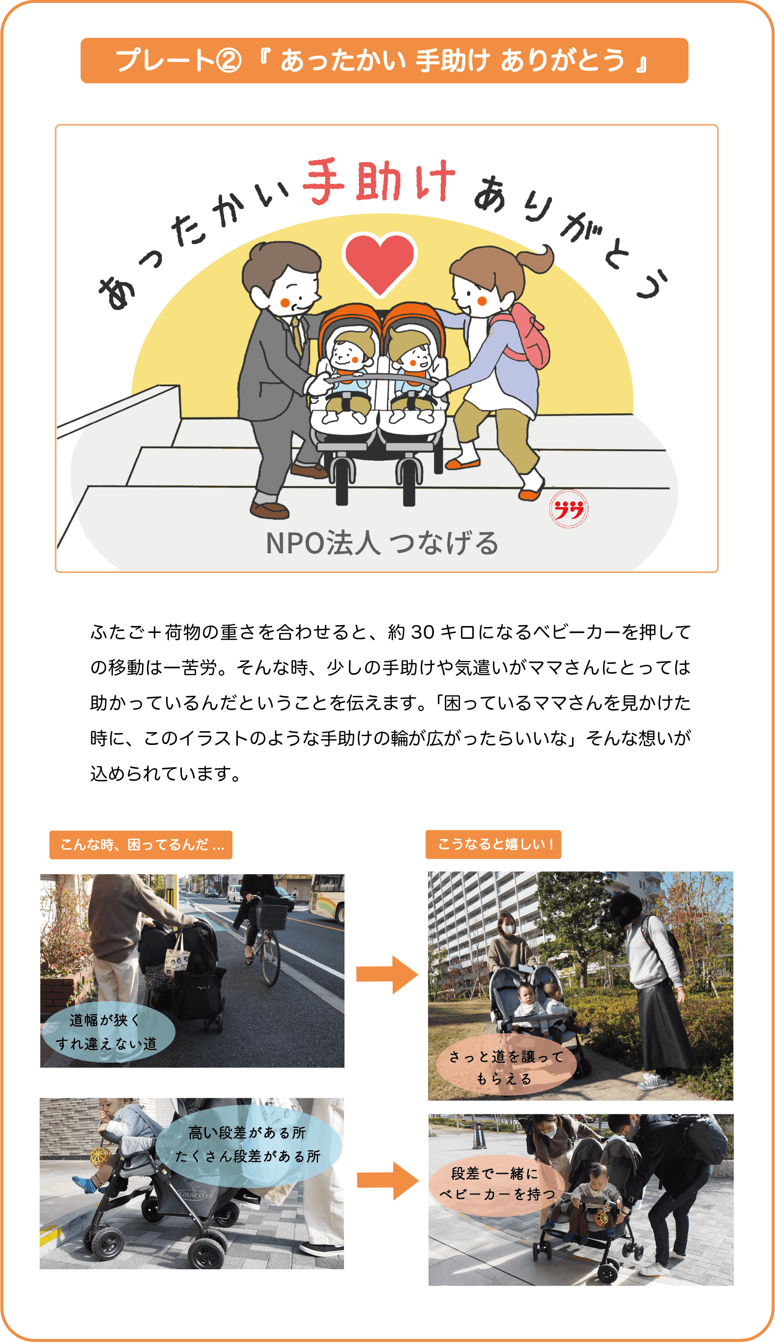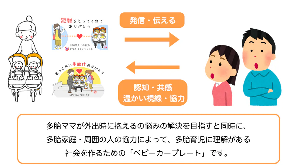 多胎ママさんの「こうしてもらえると嬉しいんだ」「こんなことに困っているんだ」という気持ちを、文字とイラストで表現し、ベビーカーにつけることで、多胎ママさんが外出時に抱える悩みの解消を目指します。