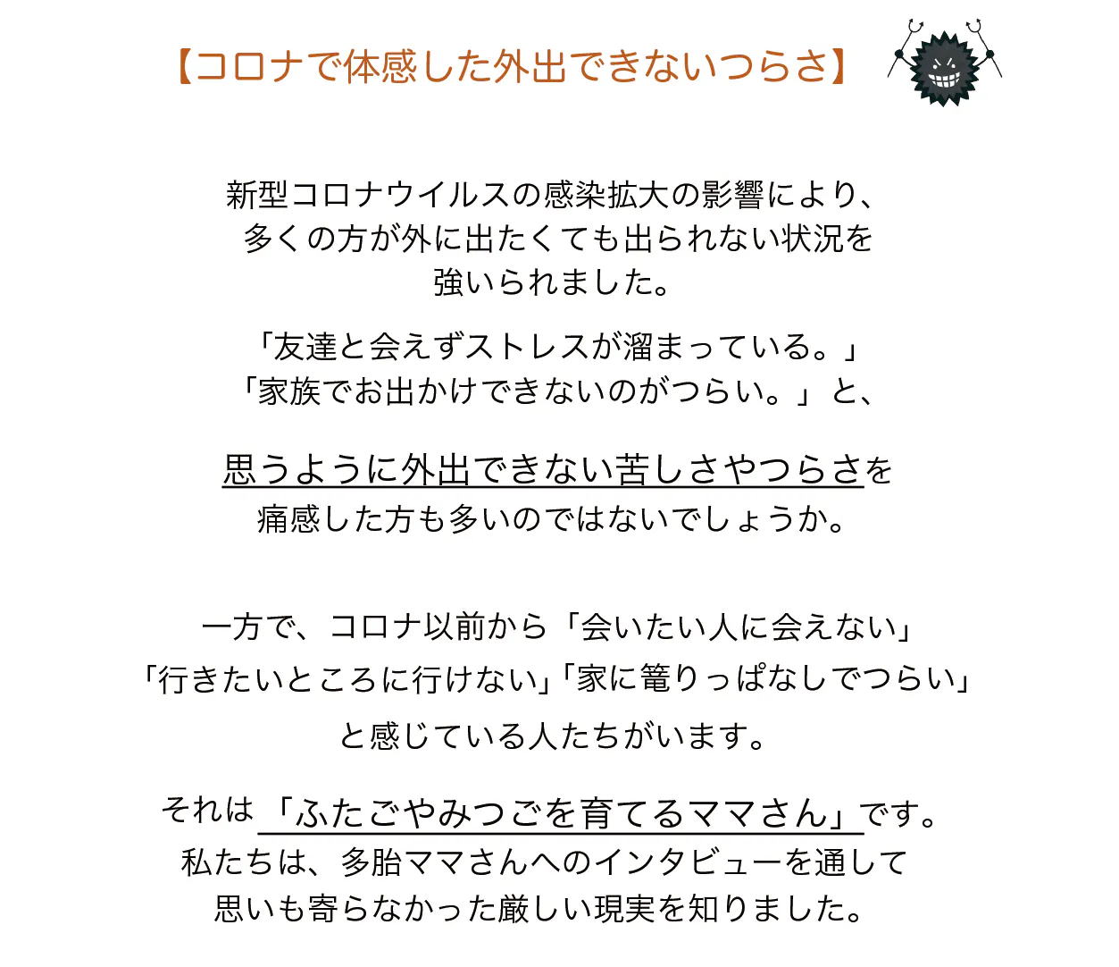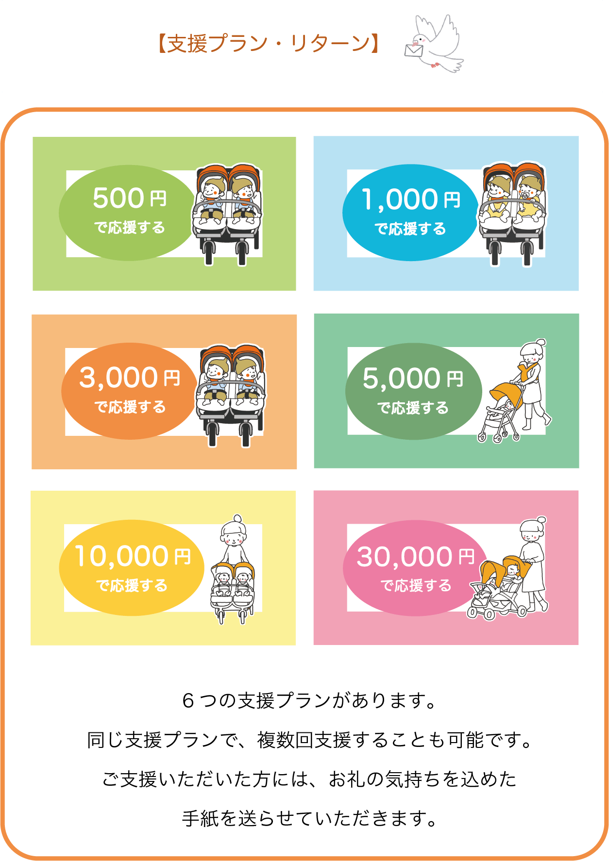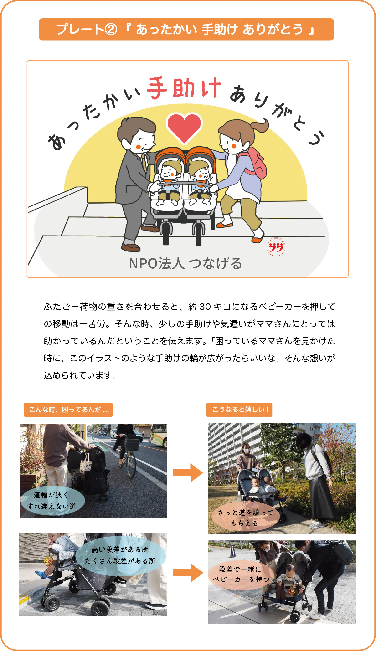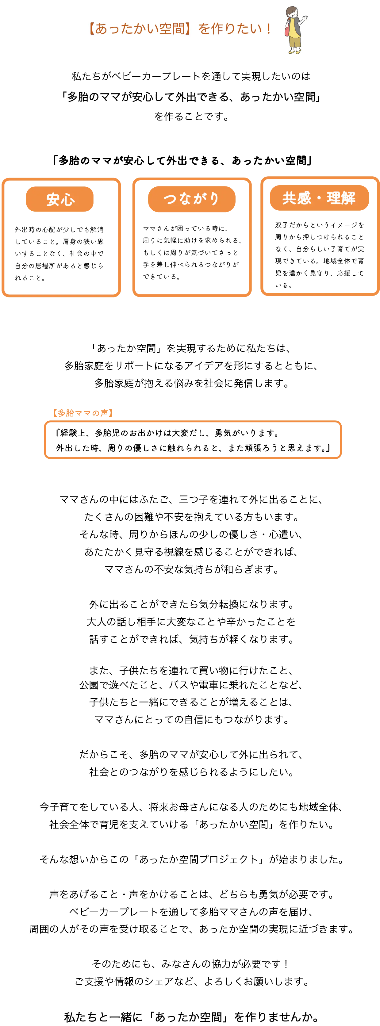多胎ママさんの「こうしてもらえると嬉しいんだ」「こんなことに困っているんだ」という気持ちを、文字とイラストで表現し、ベビーカーにつけることで、多胎ママさんが外出時に抱える悩みの解消を目指します。