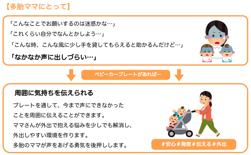 今回作成する『ベビーカープレート』とは、多胎家庭が安心して育児ができる社会を実現するための、アイデアグッズです。