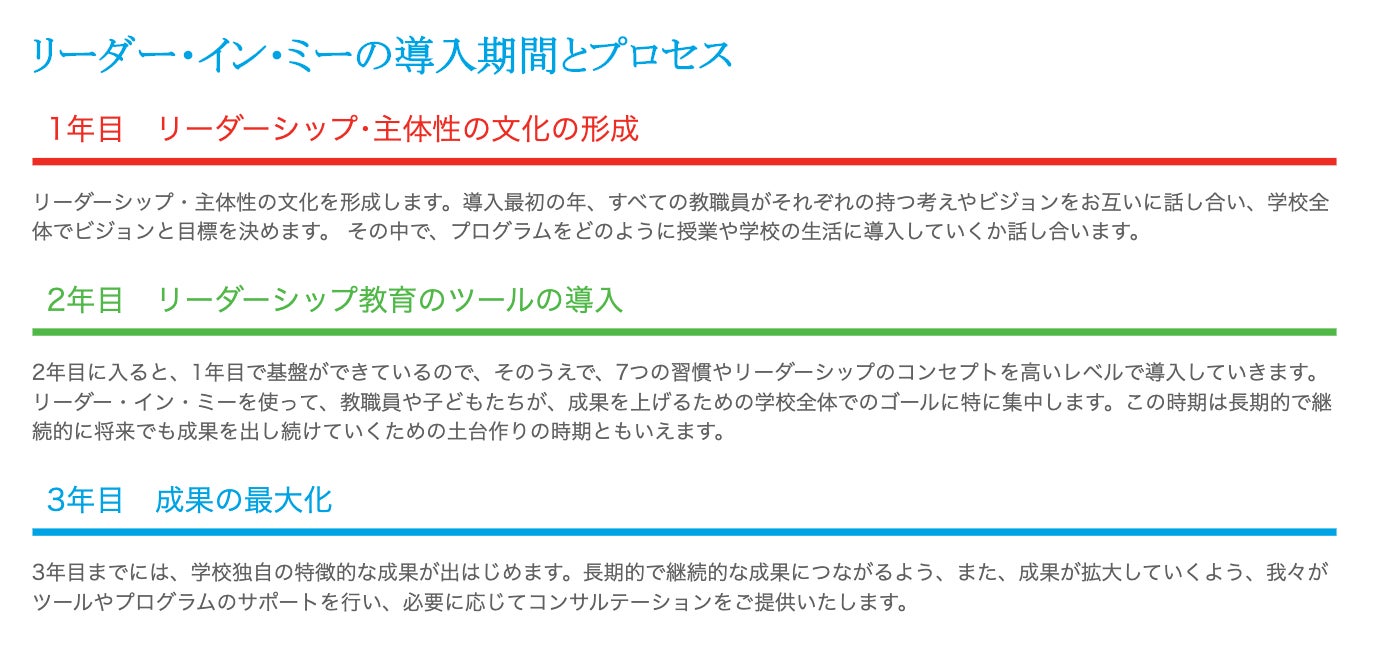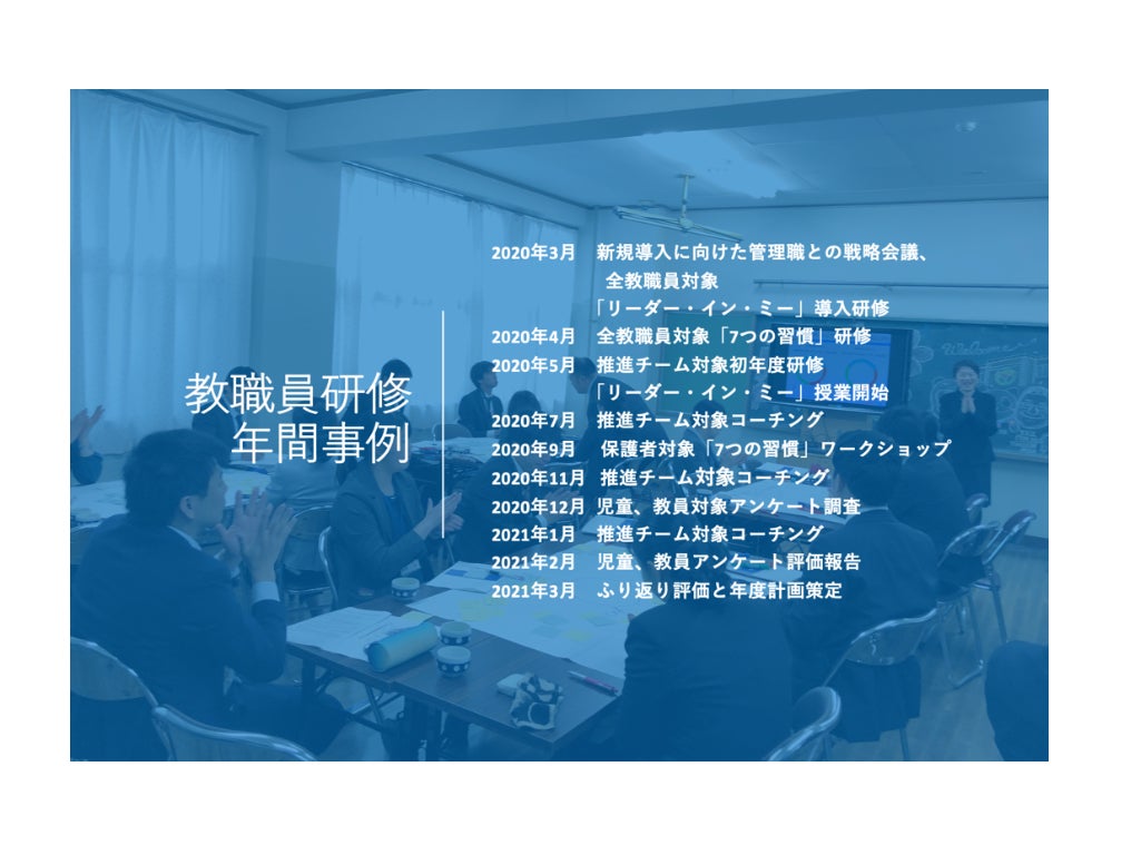 この「リーダー・イン・ミー」プログラムは、子どもたちと密に接する学校の教職員への研修から始まります。教職員自身がまずはリーダーシップを育て、発揮し、模範となります。教職員自身が日々、リーダーシップの実践を示しながら児童に教えることでより深く、質の高い理解に繋がります。