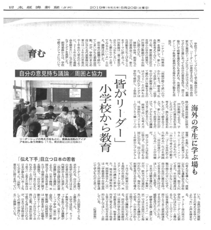 ◆ 2019年8月20日の日本経済新聞に「リーダー・イン・ミー」導入3年目となる足立区立花保小学校の記事が掲載されました。