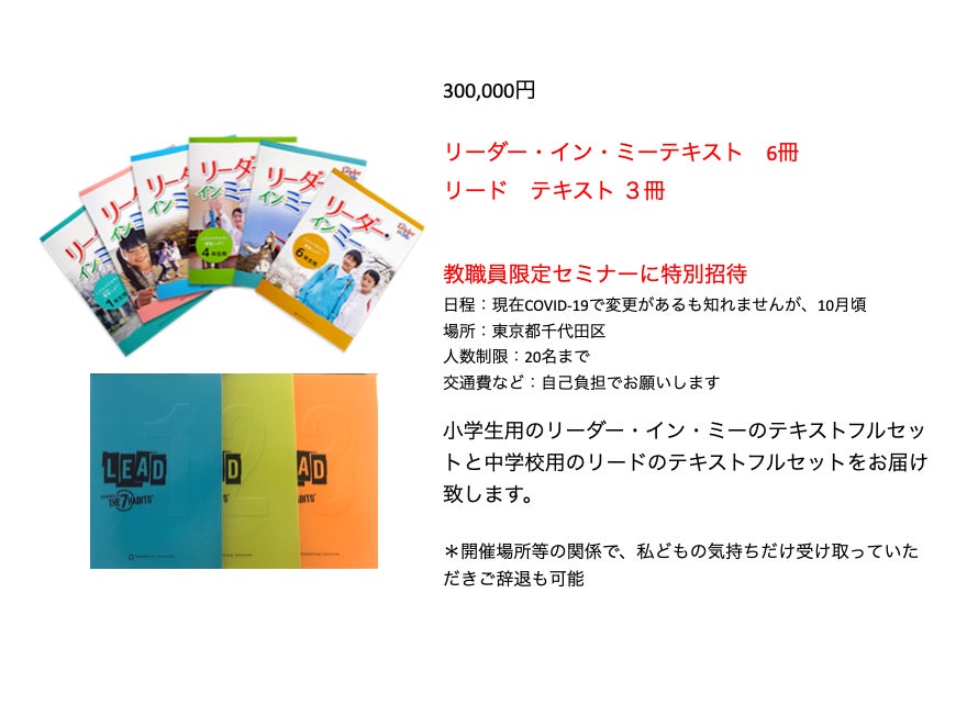 学校における「リーダー・イン・ミー」導入には地方自治体、教育委員会、学校の裁量もあり、必ずしも全国の学校へ届けられるとは限りません。また今回の新型コロナウイルスの影響により、学校が休校となることで子どもたちへの学習のチャンスが奪われる現状があります。