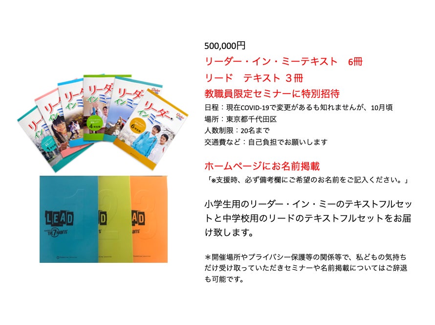 日本でより多くの子どもたちに「リーダー・イン・ミー」が届けられるよう、どうぞご支援をよろしくお願いいたします。皆様からの貴重なご支援をより効果的な教育、豊かな未来に繋げられるよう最善を尽くして参りますので、ご支援・ご協力のほど、心よりお待ちしております。