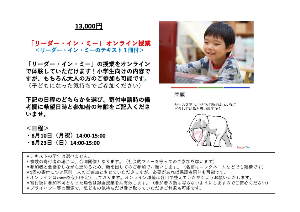 そのため、「リーダー・イン・ミー」の開発にあたるフランクリン・コヴィー・エデュケーションとともに、家庭で保護者と一緒にオンラインで「リーダー・イン・ミー」が学習できる開発を行っております。子どもと一緒に動画やイラストストーリー、ワークシート、アクティビティなどができるコンテンツを開発し、一人でも多くの子どもたちに「リーダー・イン・ミー」をお届けする費用に使わせていただきます。
