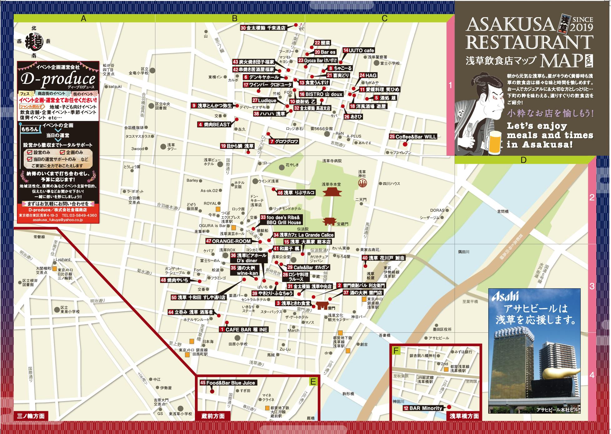 観光客の方にも浅草の色んなお店を知っていただきたいと思い、アサヒビール様の協賛のもと、インバウンド対応を兼ねた回遊性マップ「浅草レストランマップ」を12000部発刊。