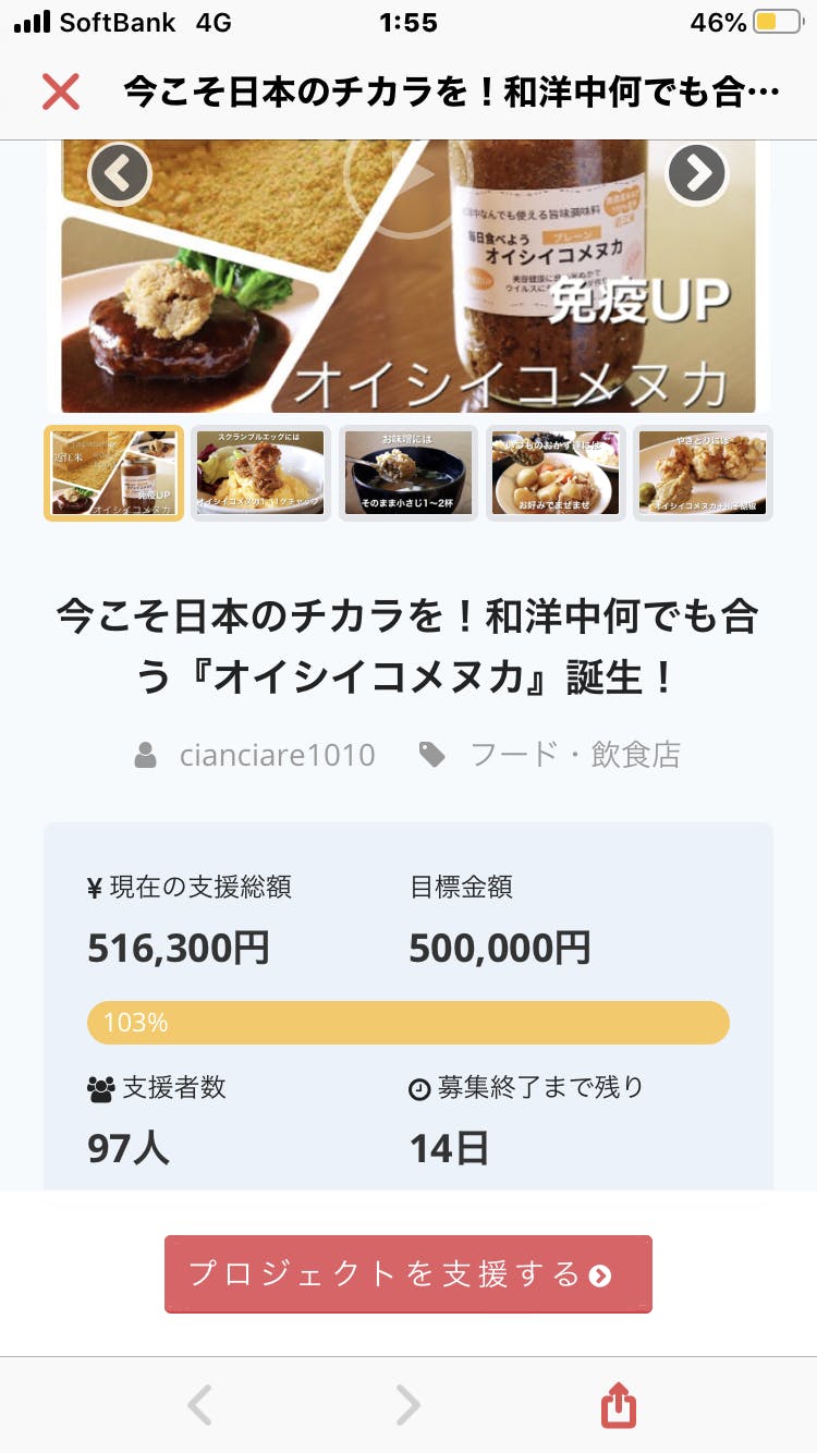 2020/05/18 02:29皆様のご支援のおかげ様で、なんと、終了まで14日を残して目標額の50万円を達成する事が出来ました!初めてのクラウドファンディング挑戦で、わからないことばかりで不安でいっぱいでしたが、皆様のおかげ様で目標達成する事が出来、とても幸せな気持ちです。このプロジェクトはオイシイコメヌカを世に送り出す為の1番最初の大事な大事なステップでしたので感慨ひとしおです。ほんとにありがとうございます。大事なステップと言いましたように、このプロジェクト成功に満足する事なくオイシイコメヌカを1人でも多くの人に食べてもらえるように、物産展や展示会への参加、企業への売込み、百貨店、農産物販売所、様々な県内のお見上げ販売所などへの販売依頼などなど、日々奔走し、邁進して行きたいと思っています。また、このプロジェクト成功のお礼といたしまして、何か支援者の方々に出来る事を考えて後日発表さしていただきます!ご支援と応援、ほんとにありがとうございます!プロジェクト終了まで、引き継ぎの応援をよろしくお願いしますm(__)m もっと見る
