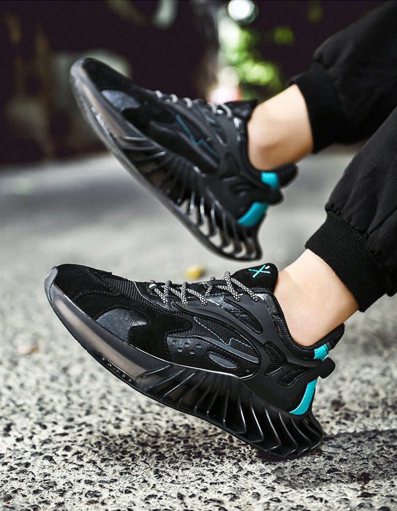 ■ソール:人間工学に即した立体網目構造で着地時の衝撃を吸収し、膝への負担を減らしてくれます。厚手TPU+ETPU素材を使用することで、従来のブレードソールより耐久性が一段と上がりました。また、一面続きの為、お手入れもしやすいです。