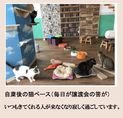 新型コロナウィルスの影響で仕方ないといえますが、いつも可愛がってくださる常連のお客様がいなくなり保護猫たちも寂しい思いをしています。