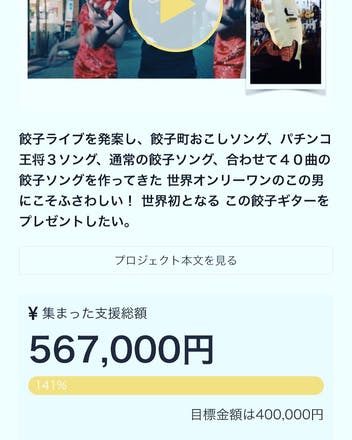 2017/05/01 11:35お陰様で、、 目標額を 達成してしまった!!!!!!! ので、 まだ加算されていく ご支援金で 何が可能か、 餃子BAND メンバーで考えたところ、、 餃子BAND の 代表曲である 涙の肉汁 の プロモーションビデオを 撮影させていただくことにしました! およそ10マン縁 ほどの資金が必要ですが、、 お陰様で ただいま 総支援額が 53マン縁 を 超えております! これで ずっと大事にしていた 私たちの歌が より 世界の皆様に お届けしやすく なります! そして この PV の エンドロールに 今回支援してくださった 皆様の お名前を 掲載させていただきたいと思っております。 このクラウドファンディング終了後に、 おあづかりしている皆様のメールアドレスに メール可能となりますので その際に PVの エンドロールに 掲載させていただく際の ご名義を 確認させていただければと 思います。 また 本日餃子界屈指の, 著名人、 人気ブログ 東京餃子通信でお馴染みの 塚田さんが ブログ内で 今回の記事をかいてくださいましたので ご紹介させていただきます! 人気ブログ 東京餃子通信 残り9日 となりましたが , ここまで 穏やかな気持ちで クラウドファンディング後半戦を迎えるとは思っておりませんでした。 ご支援くださった皆様 ありがとうございます! もっと見るクラウドBOX 作成 始動!