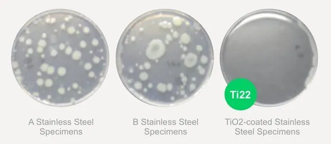 以下は、ペトリ皿に一般的なステンレス鋼標本2種類(AとB)とチタニア(TiO2)をコーティングしたステンレス鋼標本を置いて24時間経過した時点での黄色ブドウ球菌と大腸菌コロニーの繁殖状態を示しています。チタンの抗菌力の強さは一目瞭然です。