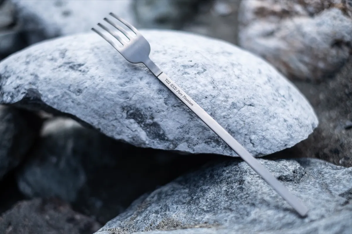 下の画像でわかるように、ステンレス製のカトラリー(左)と重量を比較すると、純チタン製の「Ensō 2.0」(右)の方がはるかに軽いことがわかります。