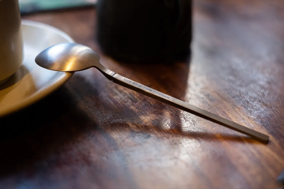 熱伝導率が低い:ステンレスや他のカトラリー素材と比べて、チタンは熱伝導率が極めて低く、室温から変化しにくい性質があります。「Ensō 2.0」のスプーンなら、熱いスープやコーヒーにしばらく浸していても熱くならないので、手を火傷しそうになることはありません。