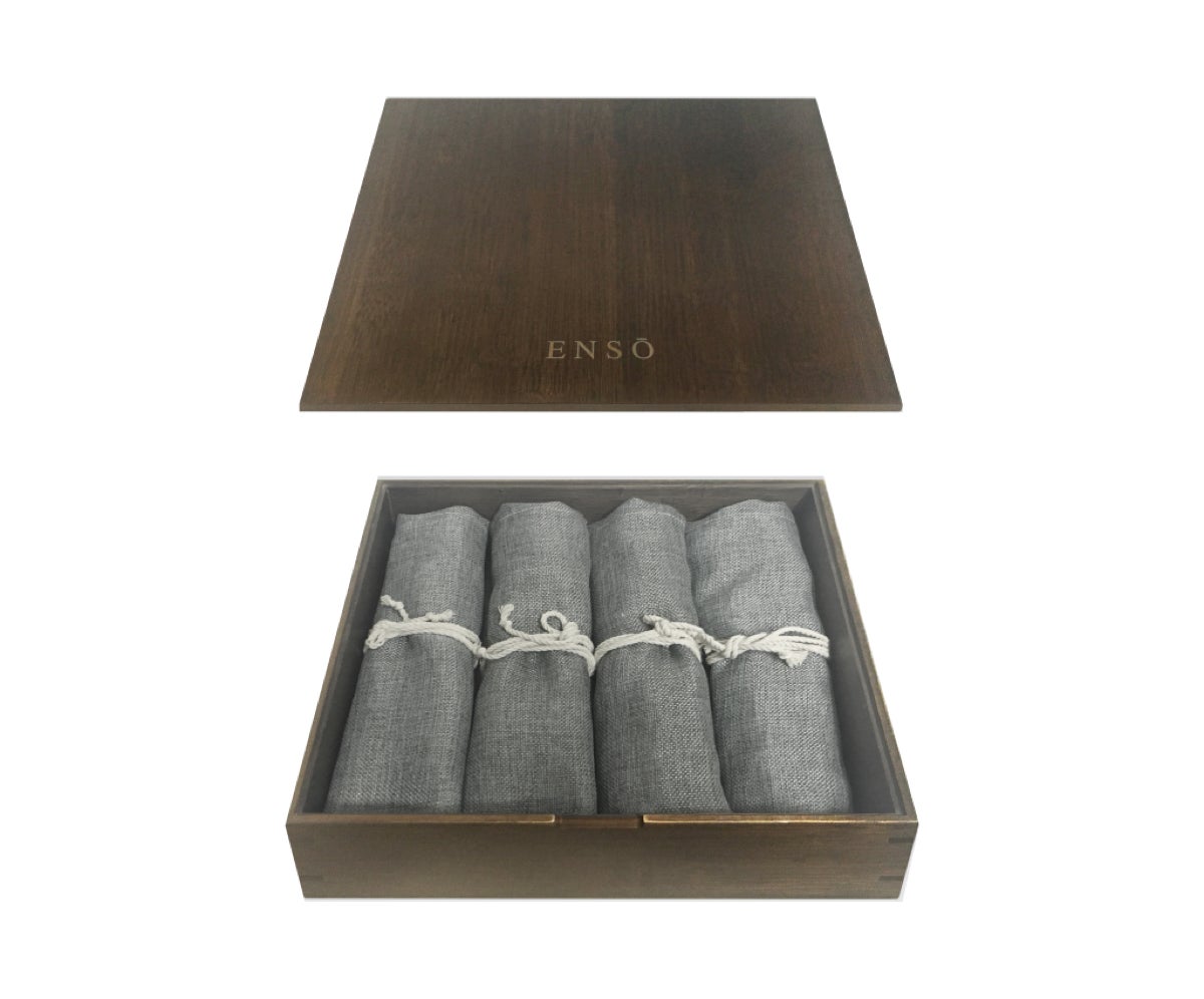 エコフレンドリーなダークバンブー製のハードボックスは、ハイエンドなカトラリーを収納するのにふさわしい美しい仕上がりです。先にご紹介したソフトキャリングポーチが4個収納できます。