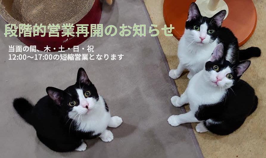 2021/06/03 20:44緊急事態宣言の発令に伴い営業自粛のため休業しておりましたが、6月5日(土)より営業時間と曜日を限定して段階的に営業を再開します。予約制となりますので、来店ご希望の方は営業時間中にお電話をいただくか、予約フォームからご連絡下さい。営業予定6月4日(金)まで:休業6月5日(土)以降、当面の間:木・土・日曜日および祝日 短縮営業(12:00~17:00)※猫の体調等により臨時休業や開店/閉店時刻の変更があります。最新の情報はブログまたはFacebookでご確認下さい。予約方法猫ルームへの入室人数制限のため、事前予約制とさせていただきます。営業時間中にお電話(03-5247-7979)をいただくか、来店予約フォームより、所定の事項をご記入の上お申し込みください。リターンの「猫カフェご利用券」についてまた、当面の間、ご来店いただける日が限られますので、クラウドファンディングのリターンとしてお送りしております猫カフェご利用券につきましては、再度有効期限を延長させていただきます。猫カフェご利用券 有効期限:2021年7月末 → 2021年10月末ご来店を検討いただいている方には営業曜日・時間の限定によりご不便をおかけいたしますが、何卒ご理解賜りますようお願い申し上げます。緊急事態宣言延長にもかかわらず営業再開とする理由4月終わりからの休業中にも近隣の方から複数の猫に関する相談をいただきました。結果、春先からの保護とあわせ、17頭の子猫を含む合計20頭以上が新たに里親様との出会いを待つことになりました。例年に比べてもとりわけ数が多く、コロナ禍で猫に関する相談をできる場所が減っていることを実感いたします。生ごみと一緒にゴミ収集車に回収される直前で救出されたコッペとメロン(7月頃デビュー予定)多くの猫達を飼養していくために、以前からご支援をいただいていたお客様にも再びご来店いただきたいこと、また、猫達との出会いによって「里親」という選択肢を考えていただける方が増えることを期待し、営業を再開することにいたしました再びの感染拡大が懸念される中での営業再開にはスタッフの中でも議論がありましたが、保護猫の飼養と譲渡は「不要不急」ではないと決断いたしました。医療関係者の方々やワクチン接種にご尽力いただいている皆様にご迷惑をかけることのないよう、万全の対策をした上で営業してまいります。皆様のご理解とご協力をよろしくお願い申し上げます。 もっと見る