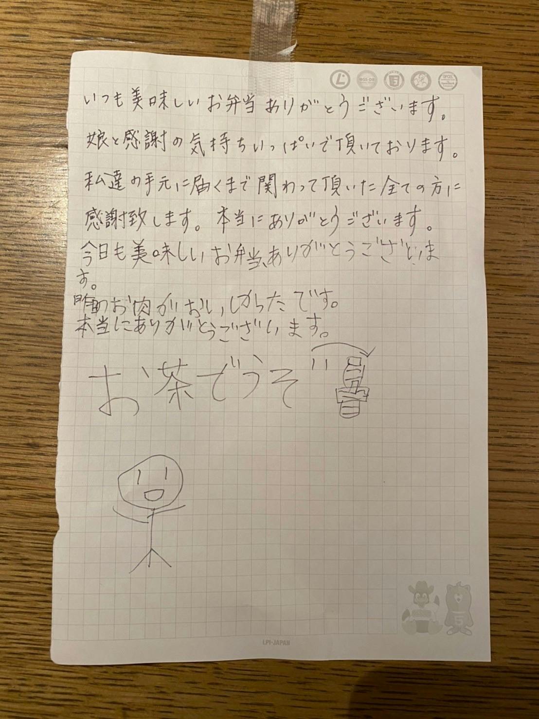 そしてこの活動を続ける中で、配達先の女の子から支援者の方に向けた手紙が届いたり、美味しそうにお弁当を食べている写真が送られてきたりと、感謝の輪が自然と広がって来ました。