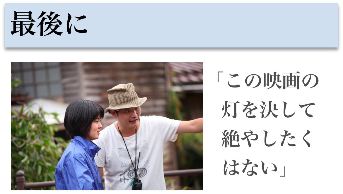 「企画をご覧になっていただき誠にありがとうございます。自分達にとっては人生をかけた作品です。この映画を楽しみにしている方々の為にも、そのほかの公開を控えている映画の為にも、映画館と必ず生き残り上映を致します。