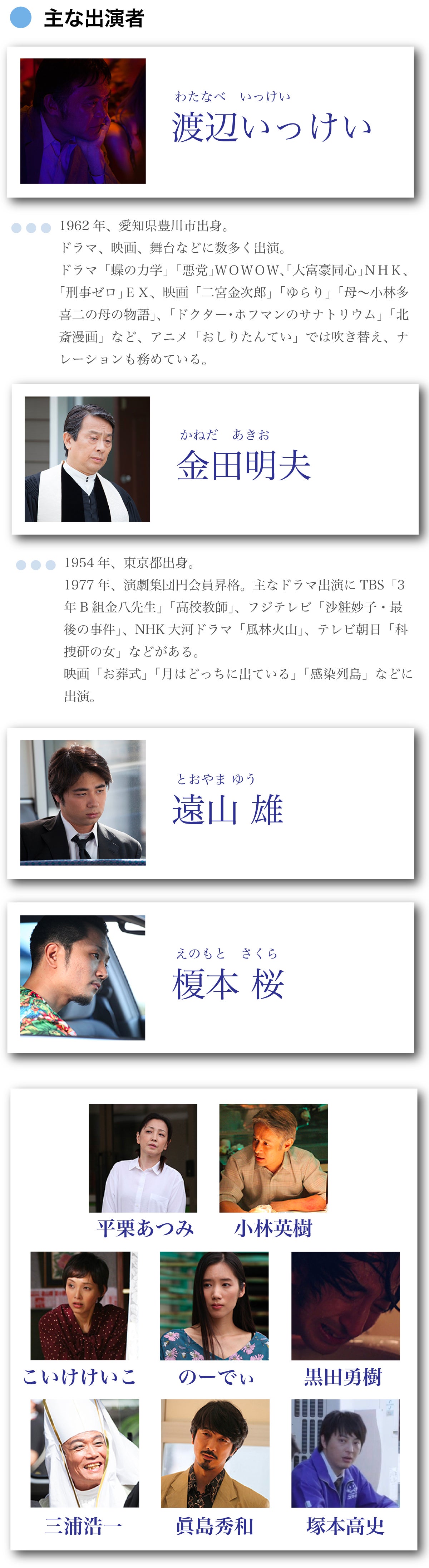 2人を取り持つキーとなる牧師・源一郎役に、ベテランの金田明夫、広志の舎弟・浩二を劇団チキンハートの榎本桜が演じるほか、三浦浩一、眞島秀和、塚本高史ら、本作監督の、劇団チキンハート演出の大山晃一郎と親交のある豪華な俳優陣が脇を固める。