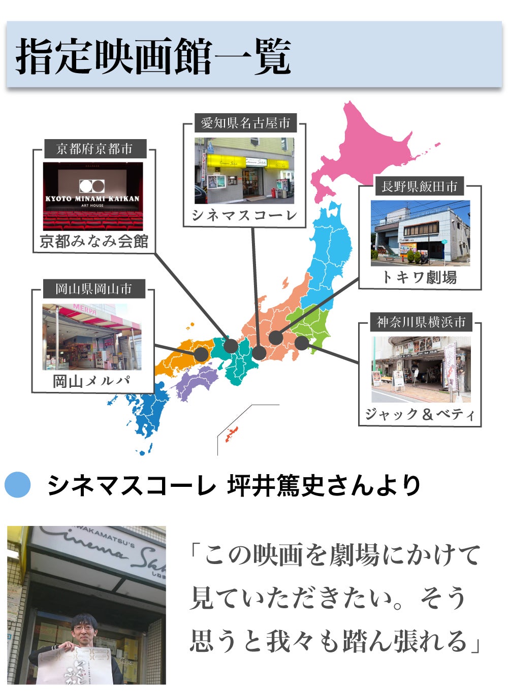 テアトル新宿(東京都、6月19日〜公開)、テアトル梅田(大阪府)、イオンシネマ松本(長野県)、千石劇場(長野県、6月19日〜公開)、イオンシネマりんくう泉南(大阪府)、神戸アートビレッジセンター(兵庫県)
