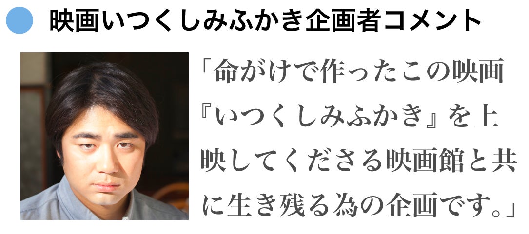 「長野県飯田市、愛知県豊川市での先行上映では普段はまったく映画館に行かない方々もたくさん映画館に来てくださいました。連日の舞台挨拶でこの映画に対する想いを伝え、それが口コミで広がっていったからだと実感しております。この企画で日頃、映画を観に行く習慣が無い方々にもぜひ映画館に行く喜びを感じて貰えるようにしたいと思っております。それにはまずは映画館の維持です。色んな形で映画館を救済する企画が持ち上がっておりますが僕らも独自にチャレンジしたいと思いました。そして日本全国の映画館で舞台挨拶を連日やりたいです。少しでも興味を持って頂けたら幸いです。」