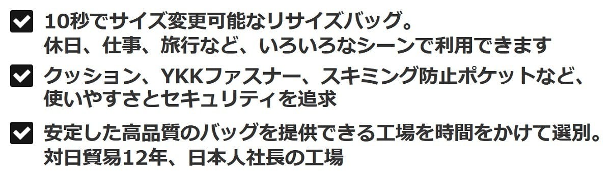 今回、製品化したリサイズバッグは、上記の「毎日使いたくなる、毎日持っている幸運をもたらすバッグ」というコンセプトで、いろいろなシーンで使えるバッグを目指しました。