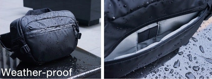 Pro Camera Sling Bagの外装は、丈夫で破れにくい420D高密度ナイロンファブリックを使用。0.03mmのPUラミネートコーティングを施して、スタイリッシュなマットブラックの仕上がりになっています。さらに撥水加工層を重ねることで、悪天候にも耐えられる防水性も加えました。