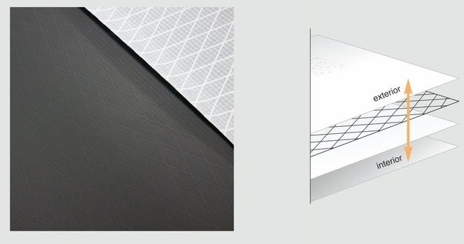 2層目: 高強力ポリエステルを撚って強靭な紐を作りそれをエックス状に組んだX-PLY®。バイアス方向に張り巡らせることで、織物の弱点である斜め方向への伸びを抑える。バイアス安定性と引裂強度が強い。