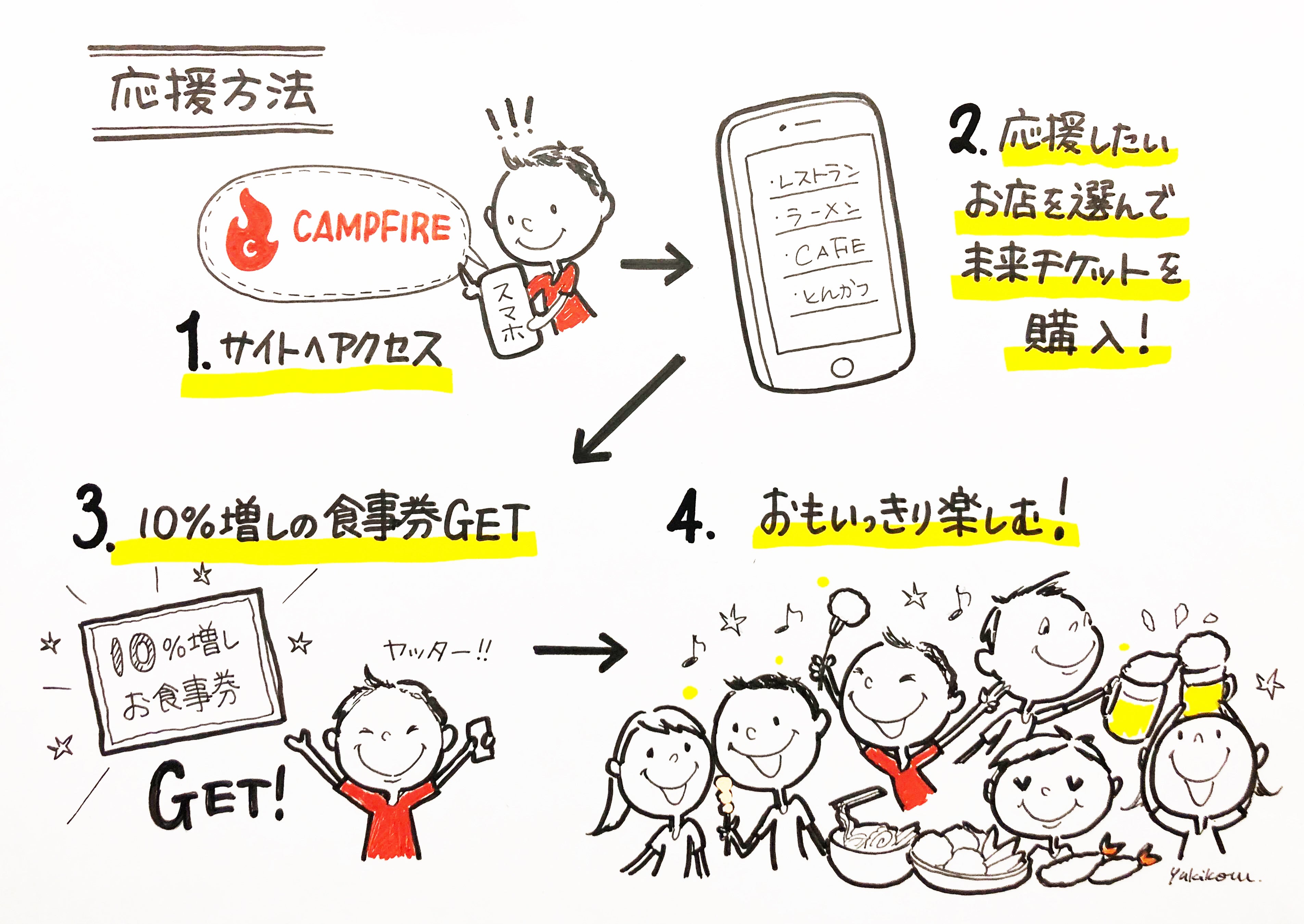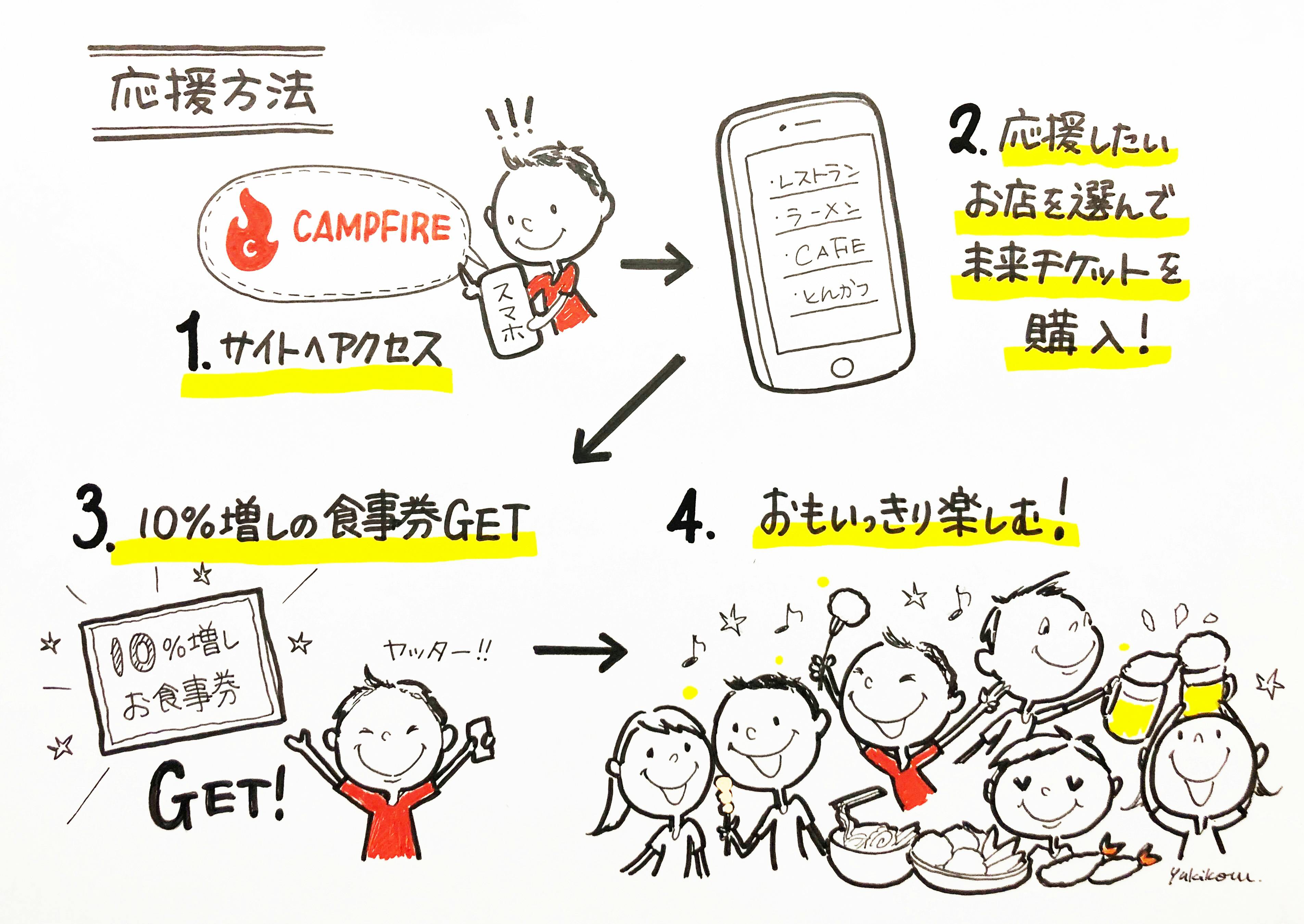SNS等のシェアや、会話の中での話題など、どのような形でも良いので1人でも多くの方にこの飲食店支援のプロジェクトの存在を広めてくださいませ!