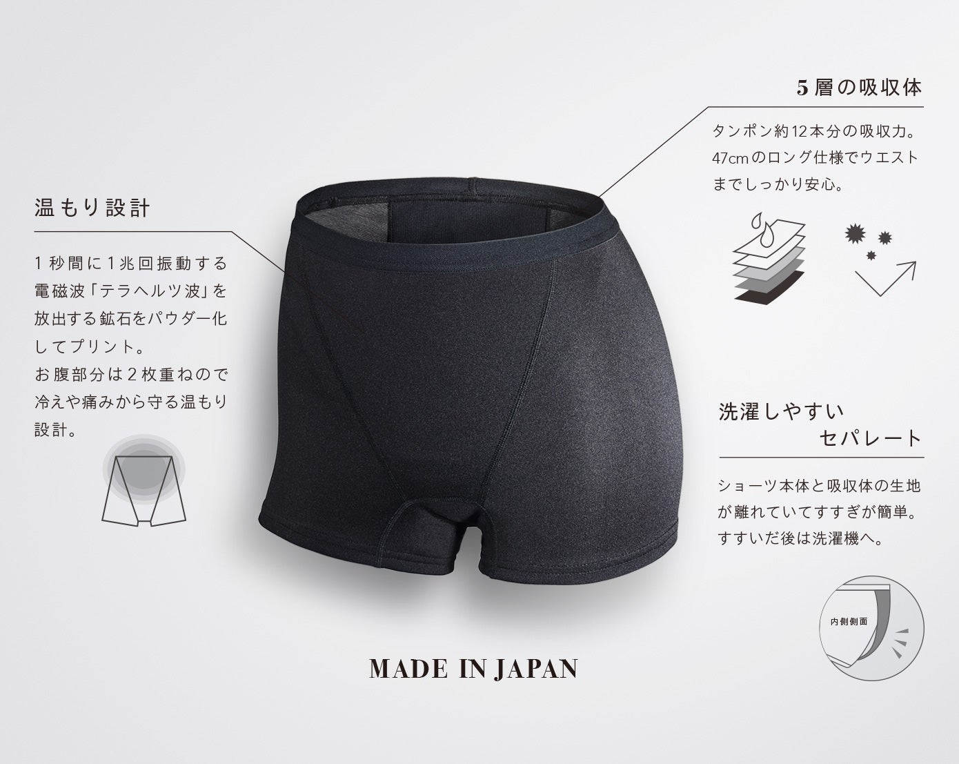 この特殊な生地は、ショーツの前面内側、お腹を覆う部分へと施しています。洗濯で落ちる心配はありません。