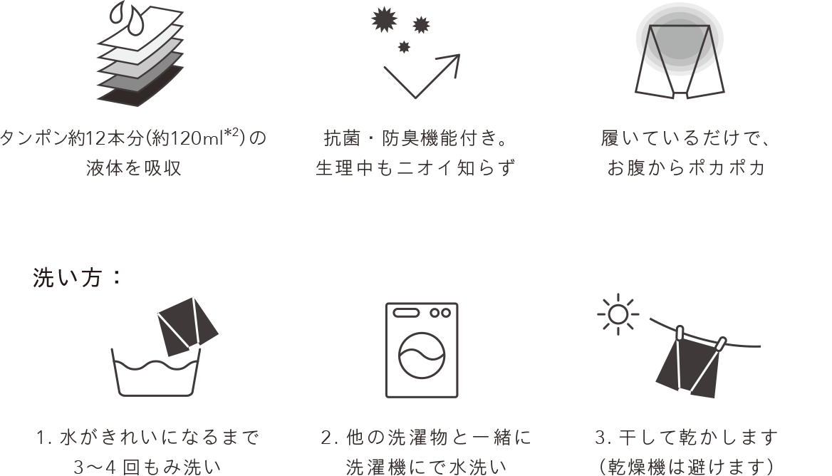 100回洗濯を繰り返しても、吸収量約120ml*1を保っていることを実証済み*2ですが、経年劣化による生地の寿命があります。普段お使いのショーツと同じ感覚でご使用ください。