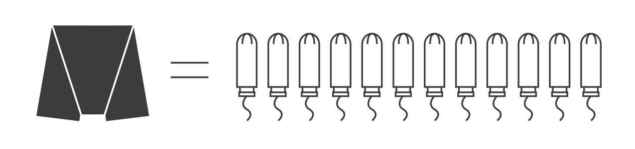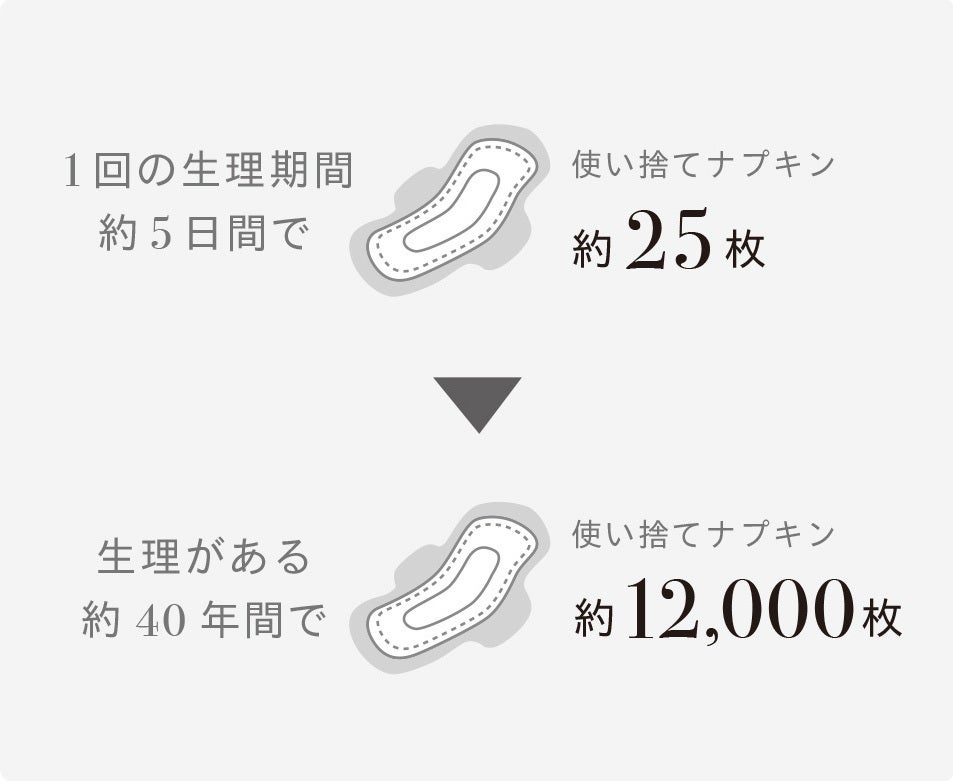 例えば、使い捨ての生理用ナプキンを1日5枚使用すると考えましょう。1度の生理期間(5日間として)で25枚、生涯で約12,000枚もの生理用ナプキンを使用することになります。