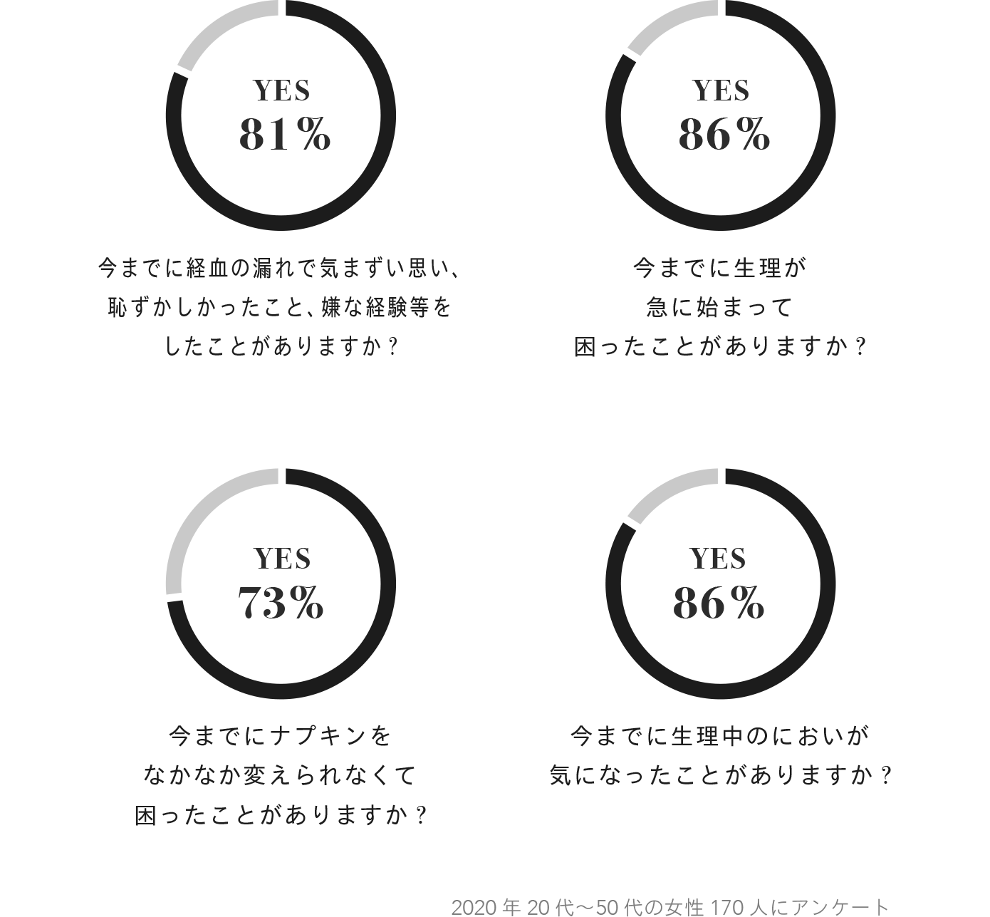 さらに、多忙や長時間勤務、着脱が容易ではない特殊服の着用などの理由から、ナプキンやタンポンを自由なタイミングで取り替えることができない状況では、その不安と不便さはより一層増すのではないでしょうか。