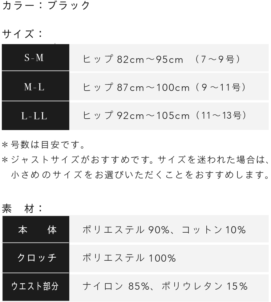 ジャストサイズではいていただくのがおすすめです。サイズに悩まれた場合は、小さいサイズの方をお選びいただくことをおすすめしております。
