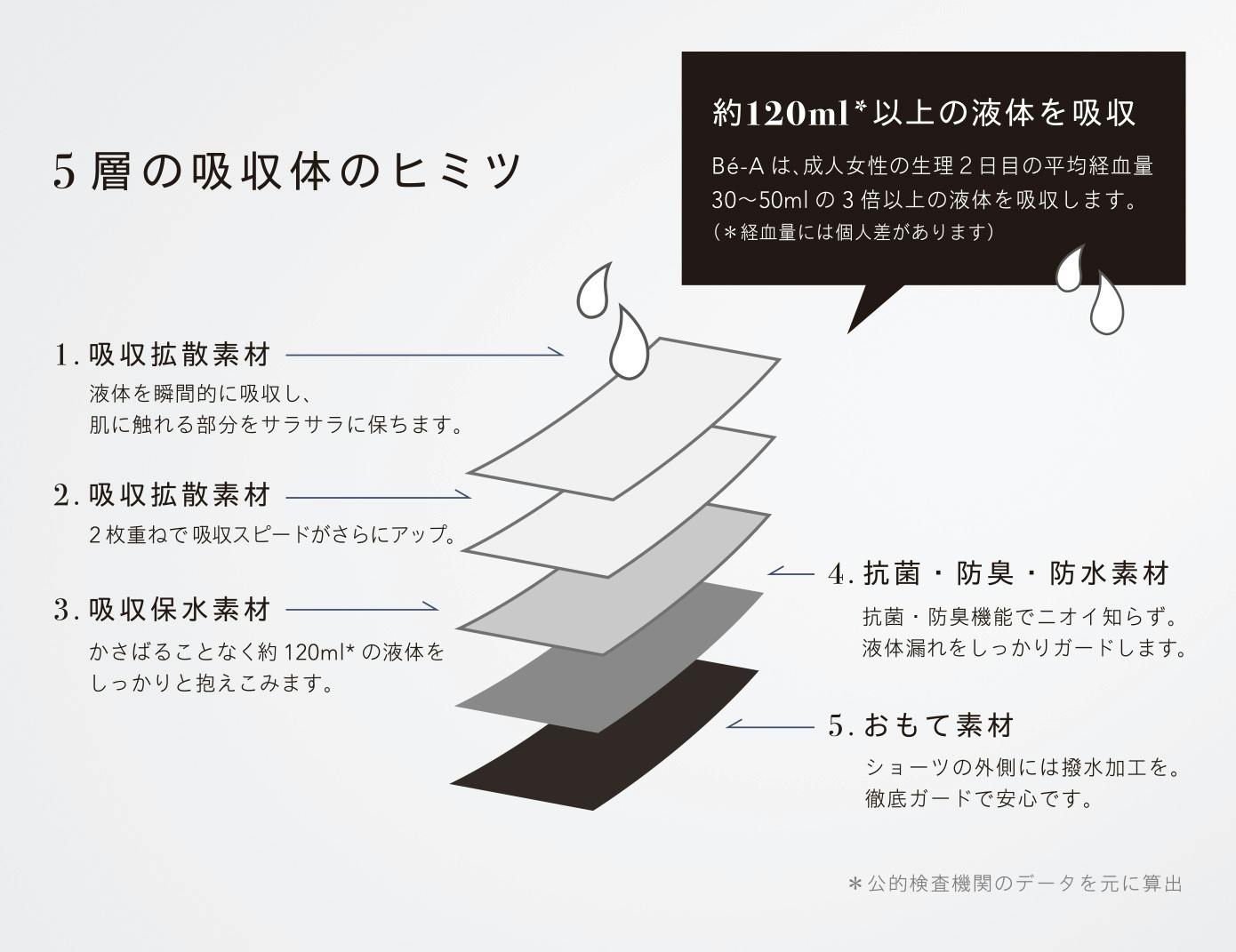 成人女性の生理2日目の平均経血量は、30〜50mlといわれています。Bé-A《ベア》はそのおよそ3倍もの吸収量を実現しました。(経血量には個人差があります)