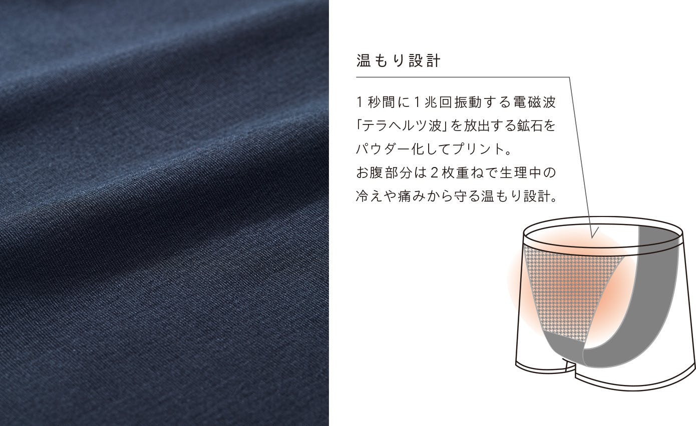 この特殊な生地は、ショーツの前面内側、お腹を覆う部分へと施しています。洗濯で落ちる心配はありません。