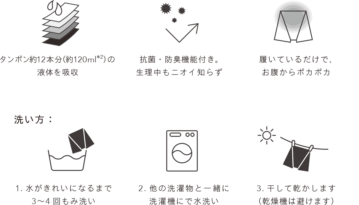 100回洗濯を繰り返しても、吸収量約120ml*1を保っていることを実証済み*2ですが、経年劣化による生地の寿命があります。普段お使いのショーツと同じ感覚でご使用ください。