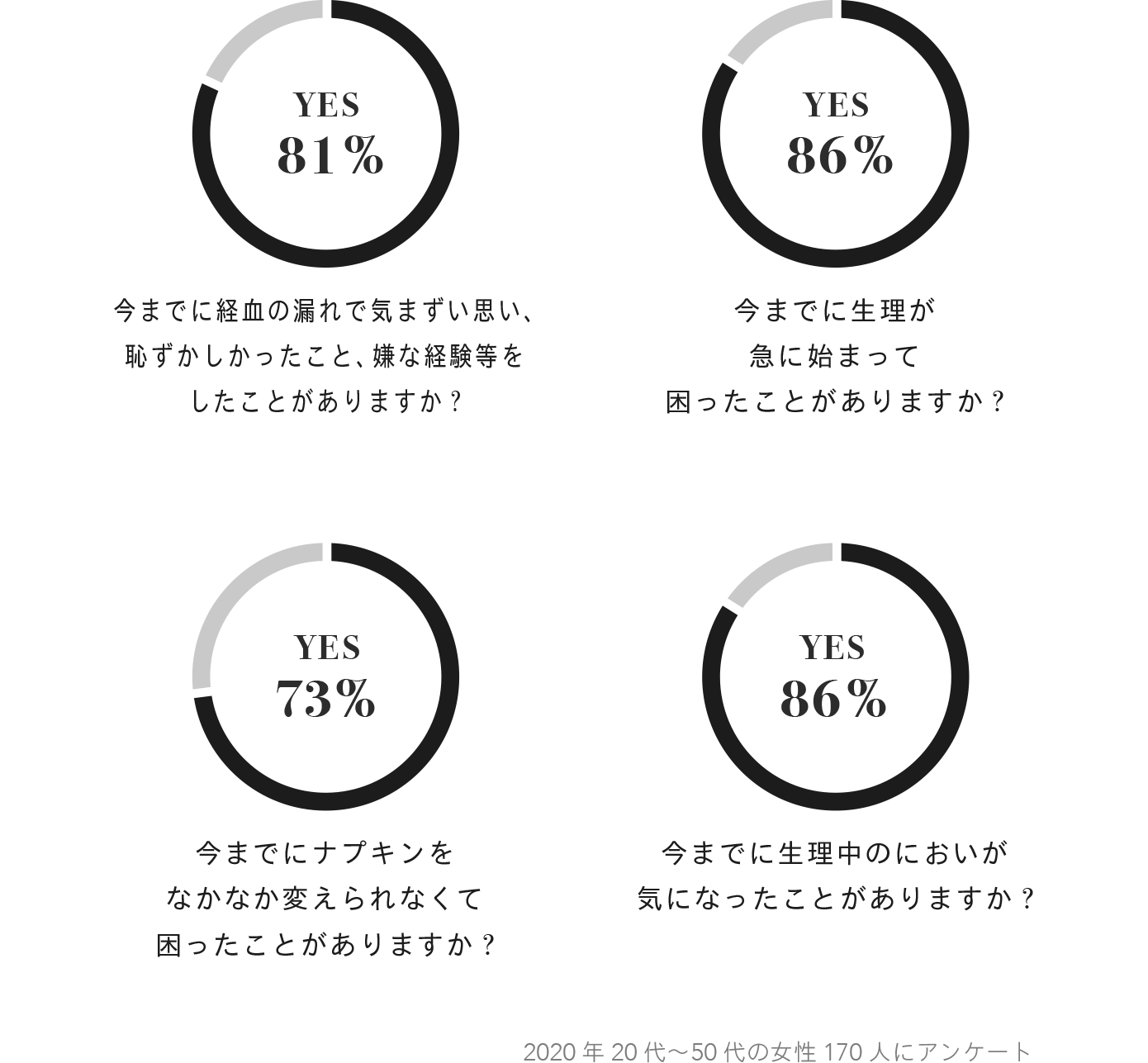 さらに、多忙や長時間勤務、着脱が容易ではない特殊服の着用などの理由から、ナプキンやタンポンを自由なタイミングで取り替えることができない状況では、その不安と不便さはより一層増すのではないでしょうか。