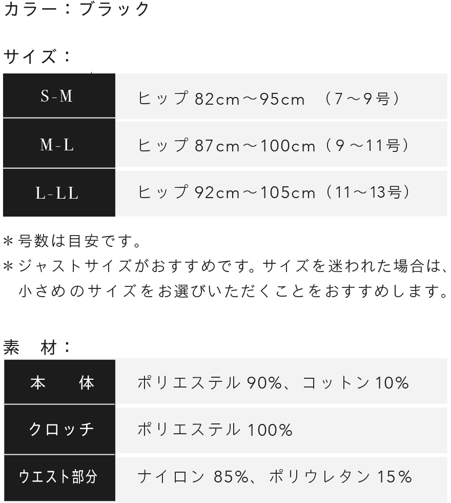 ジャストサイズではいていただくのがおすすめです。サイズに悩まれた場合は、小さいサイズの方をお選びいただくことをおすすめしております。