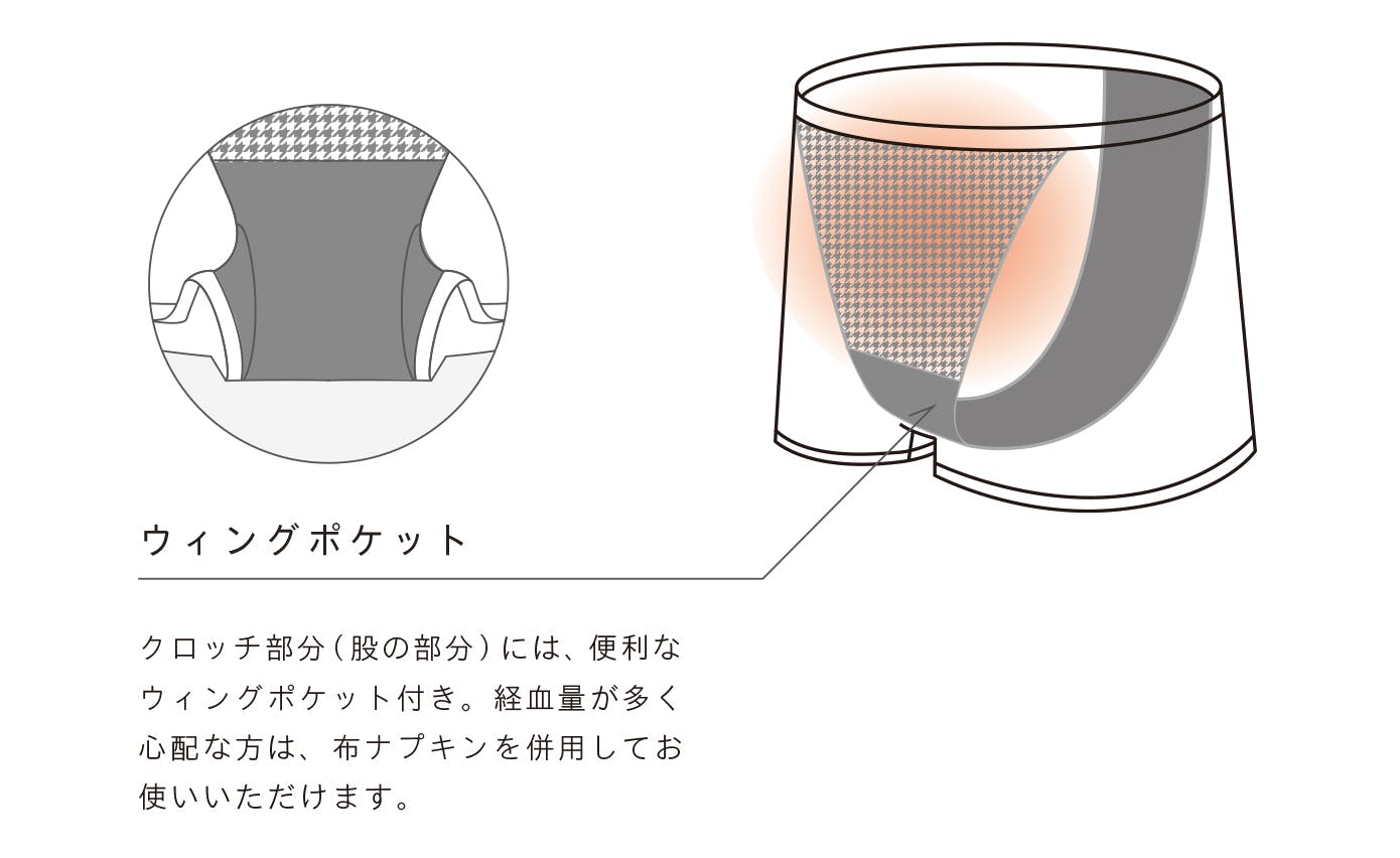 経血量には個人差があります。また、月によっても量に違いがあることを考慮し、クロッチ部分(股の部分)には、便利なウィングポケットを付けました。