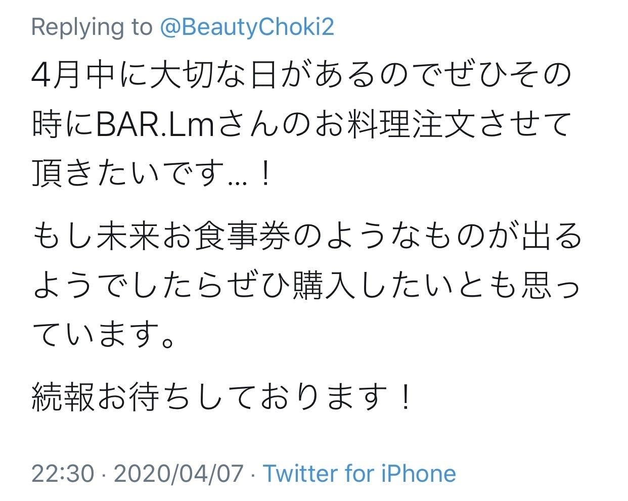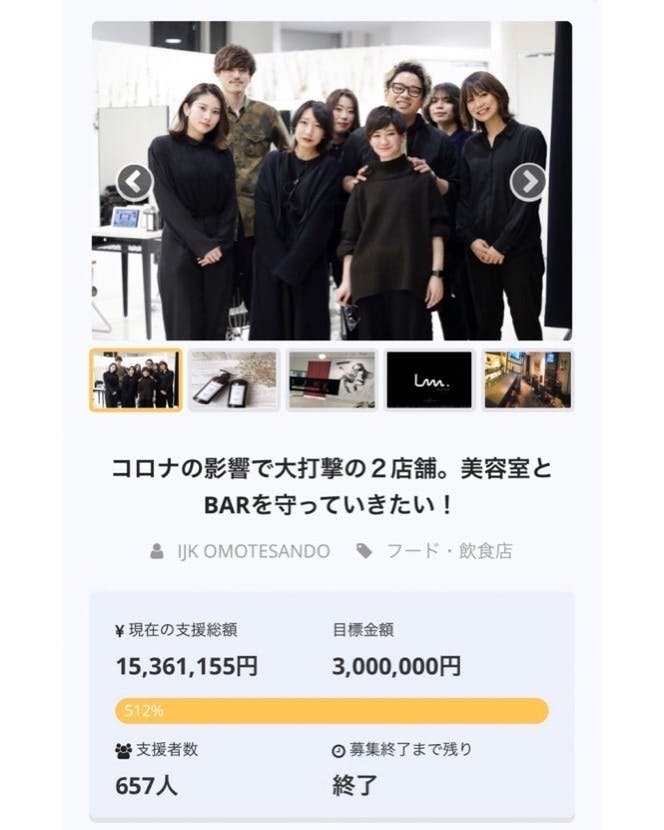 • はじめに代表の芝原です。皆様、本当に沢山のご支援を頂きまして誠に有難うございます。弊社のクラウドファンディング期間も残り5日となりました。現在約1200万円もの支援金が集まっており驚きと感動で胸が一杯です。心より御礼申し上げます。有難う御座います!!!!リターンのお届けについてクラウドファンディング終了後にご登録頂いているメールアドレスに順次リターンのご案内をさせて頂きますので今しばらくお待ちください。シャンプートリートメントなどのリターンは6/1より順番に発送させて頂きます。お店での受け取りをご希望の方は是非ご連絡頂けますと幸いです。到着まで今しばらくお待ち下さい。新しく追加したリターンについて残り5日ですが新しくリターンを追加致しました。3900円...祝!大感謝!!クラウドファンディング目標達成記念イベント参加券!!!(コロナ明けのどこかの日曜日夜17:00〜23:00開催予定。イベント時間内は入退場自由に可能)IJKとLm.スタッフも全員参加!BAR Lm.で飲んで食べての立食パーティー!是非感謝のお気持ちを直接お伝えさせて下さい!原価度外視食べ飲み放題のイベント参加券!感謝の気持ち「thank you」にかけて3900円。40名限定となります! ※コロナウイルスが収束後のどこかの日曜日でイベントを行わせて頂きます。※イベント日にどうしても日程が合わず参加できない方で返金希望の方は3900円を返金致します。※万が一第二波などでイベント開催ができなくなった場合も全額返金致します※未成年不可10000円...【芝原代表or恵梨香店長orカワイミオ副店長とZOOMで1時間飲める券(1時間)】経営相談、美容師の相談。「ただただZOOM飲みしたい!」なんでもOKです。備考欄に芝原or恵梨香orカワイミオの誰とZOOMのみ希望かを記載して下さい。※日程はプロジェクト終了後にメールですり合わせさせてください。※有効期限無し。※未成年の方はノンアルコールでの対応となります。閉じる30000円...芝原代表とBAR Lm.で飲める券(2h)経営相談、美容師の相談。「ただただ飲んでみたい!」なんでもOKです。※その日の飲み代はかかりません。※日程はプロジェクト終了後に芝原とすり合わせさせてください。※有効期限無し。コロナ収束後でも勿論可能です!※未成年の方はノンアルコールでの対応となります。他にもBAR Lm.のドリンクチケットなど途中で追加したリターンも数多くございます。是非今一度ご覧になってみてください。最後に改めましてご支援頂きました皆様本当に本当にありがとうございます。こんなにも皆様に応援して頂いてるお店なんだと実感し、毎日感無量の想いです。しっかりとリターンをお届けし、皆様に喜んで頂けますよう尽力して参ります。そして、頂いたご支援と応援を胸にコロナウイルスに負けず、より一層良いお店作りをして参ります。残り5日となりましたが、引き続き何卒宜しくお願い致します。 もっと見る