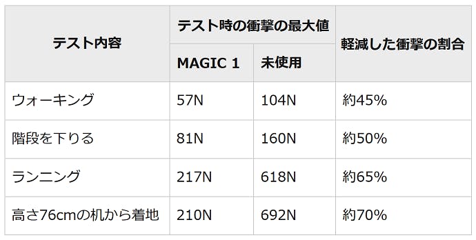 MAGIC 1は、ウォーキングのテストで、衝撃の大きさは45%軽減。単純に45%軽減の計算をすると上記の