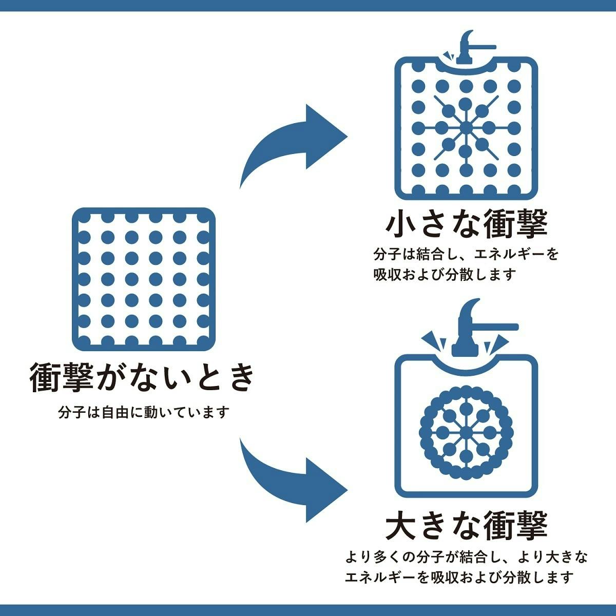 MAGIC 1は、特許取得の非ニュートン複合材料で作られてます。この素材は、衝撃が大きいほどクッション性(分子の結合数)が上がる素材で、素材の分子自らが衝撃の強さを感知し、クッション性を変化させることから知能衝撃吸収素材と呼ばれています。