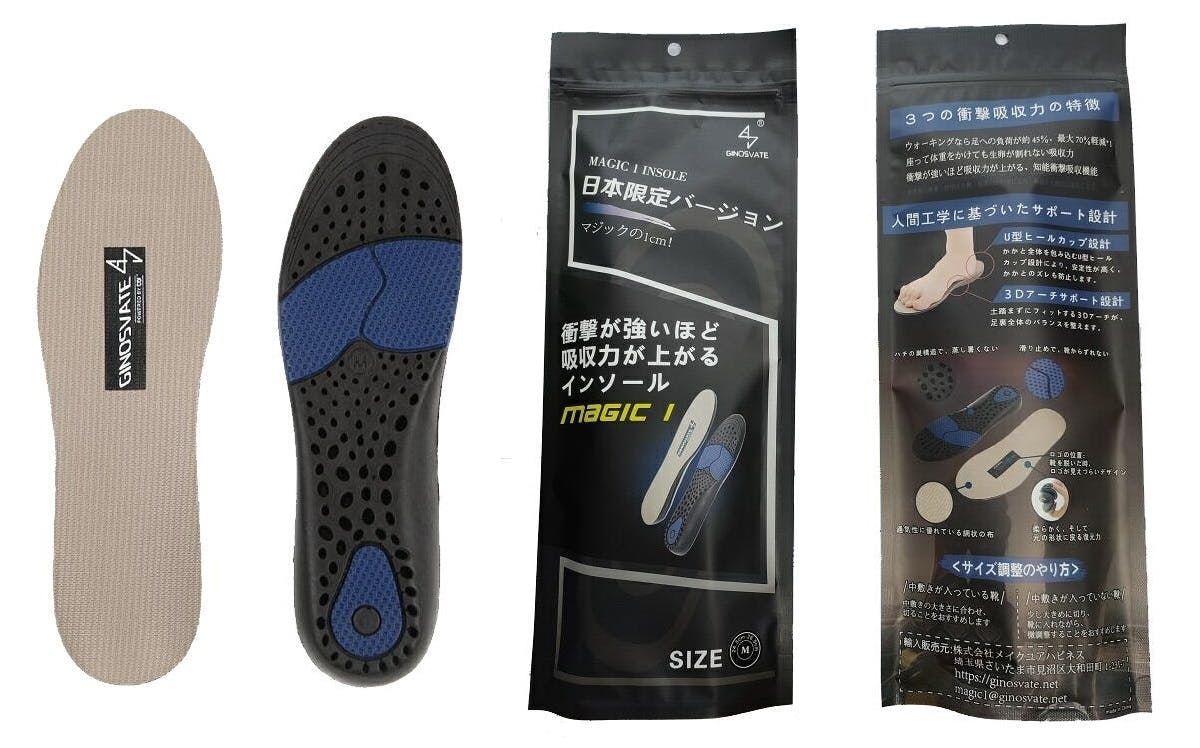比較テストに合格した素材で製品化したMAGIC 1は、卵が割れない衝撃吸収力で足への負荷が約45~70%軽減、衝撃が強いほどクッション性が上がる、知能衝撃吸収インソールです。