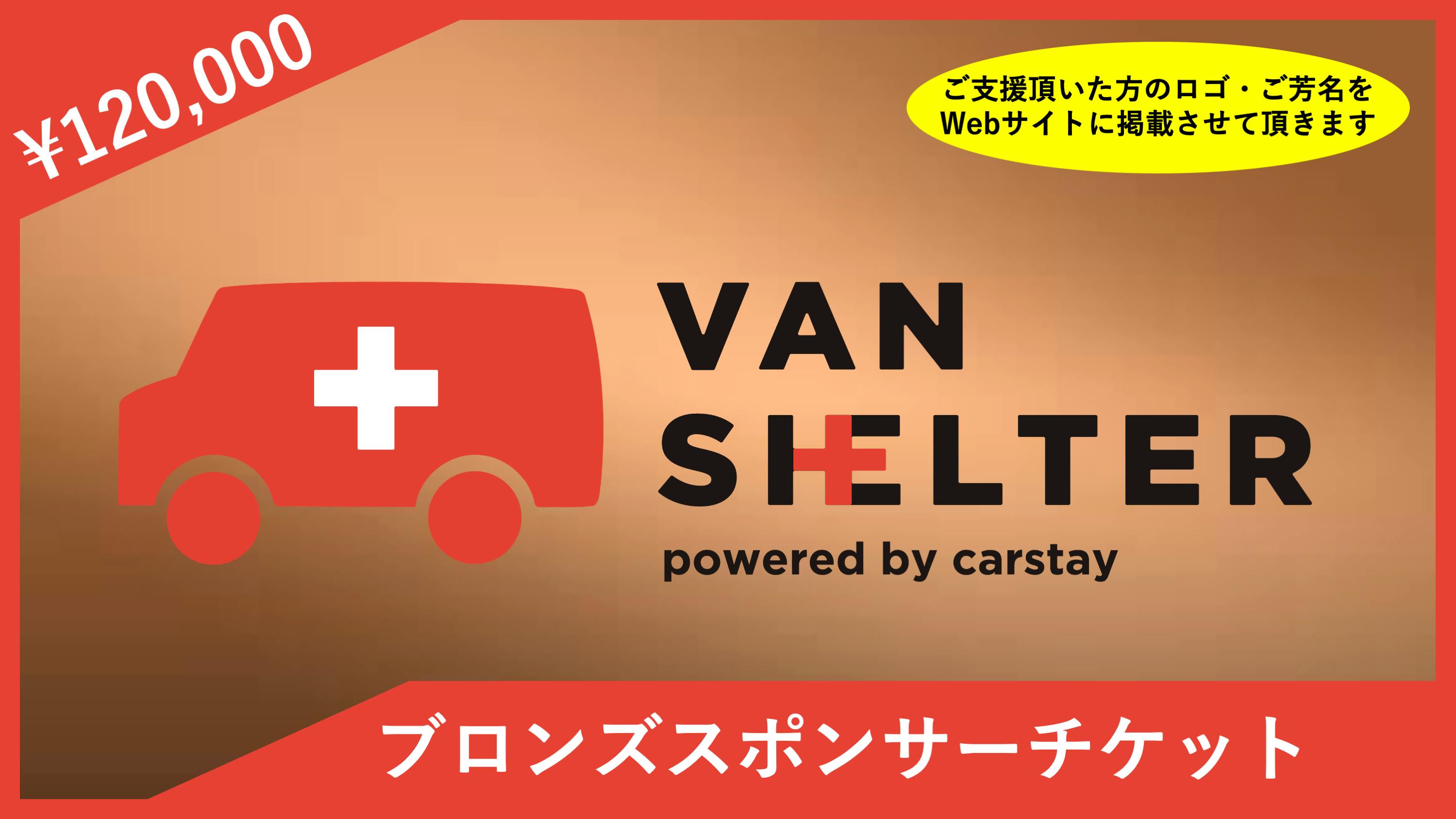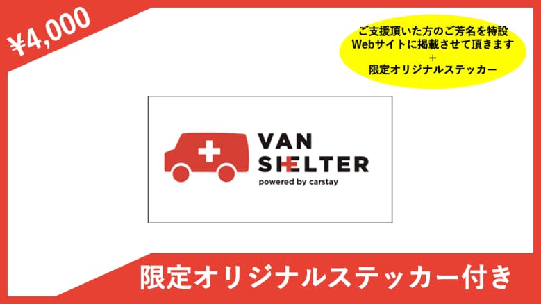 ● ご支援頂いた法人さま(または個人さま)のロゴデザイン(中)・ご芳名を特設Webサイト(Carstay.jp/jp/vanshelter ※月間約30万PV)および活動報告書に掲載させて頂きます。支援時、必ず備考欄にご希望のお名前をご記入下さい。希望されない方は、備考欄にその旨をご記入下さい。