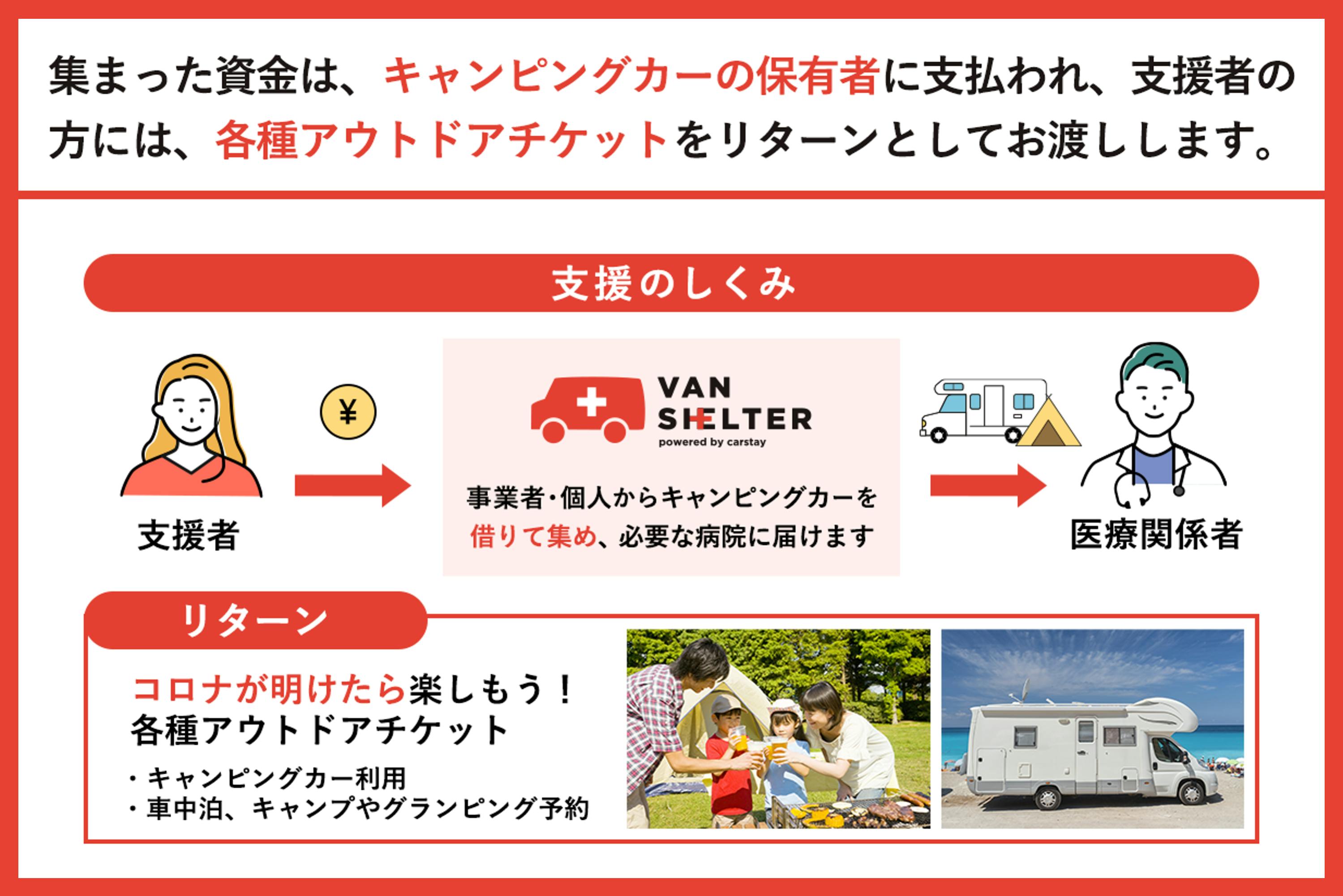 ※ キャンピングカーの貸出をご希望される、医療機関・自治体さま、キャンピングカーをご提供頂けるオーナーさまは van.shelter@carstay.jp までご連絡頂けましたら幸いです。