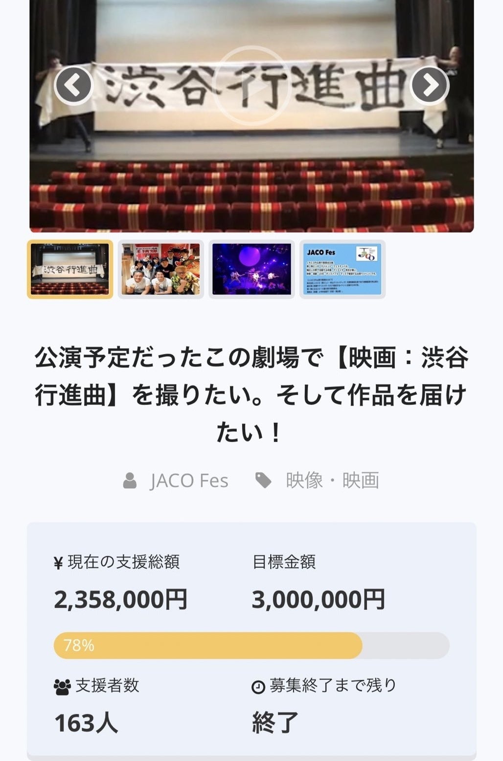 2020/09/03 21:00この度は、皆様からのご支援ご協力を頂きました映画「渋谷行進曲」の撮影が8月に無事終了致しましたことをご報告させて頂きます。今後は、ご購入いただきましたリターンと、本作品を皆様の元へお届けできるよう、制作へと力を注いでいく次第です。そして、リターンにて来春4月に開催予定と明記されておりましたイベント上映会の日程変更のお知らせをさせて頂きます。----------映画「渋谷行進曲」イベント上映会日時:2020年 12月27日(日) 28日(月) 29日(火)会場:ユーロスペース 渋谷区円山町1-5 KINOHAUS 3F http://www.eurospace.co.jp/----------現在、こちらの上映会は該当リターンをご購入頂きました皆様と、別途チケット購入の上、一般の方も参加可能なイベントとなる予定です。※一般参加の方は、人数制限ありその他、当日のタイムスケジュール等の詳細は改めてアナウンスをさせて頂きます。※上記日程での参加が厳しいリターン該当者様はご連絡下さいませ。また、新型コロナウイルスの発生状況を踏まえ、やむ追えず開催日時が変更となる可能性も考えられます。その場合は、直ちにお知らせをさせて頂きますので何卒、ご理解ご了承いただけますと幸いです。最後になりますが、時節柄変化のある時期かと存じますので、皆様もどうぞお身体ご自愛くださいませ。一同、皆様にお会いできる日を心待ちにしております。今後ともどうぞ宜しくお願い致します!JACO Fes実行委員会----------「10時だよ、JACO10!夜10時はJACO10でドラマ&トーク番組」 平日22時から生配信 https://live.line.me/channels/5238948アーカイブ https://youtu.be/xkNUSgJ9owgHP http://www.jacofes.com/ もっと見る
